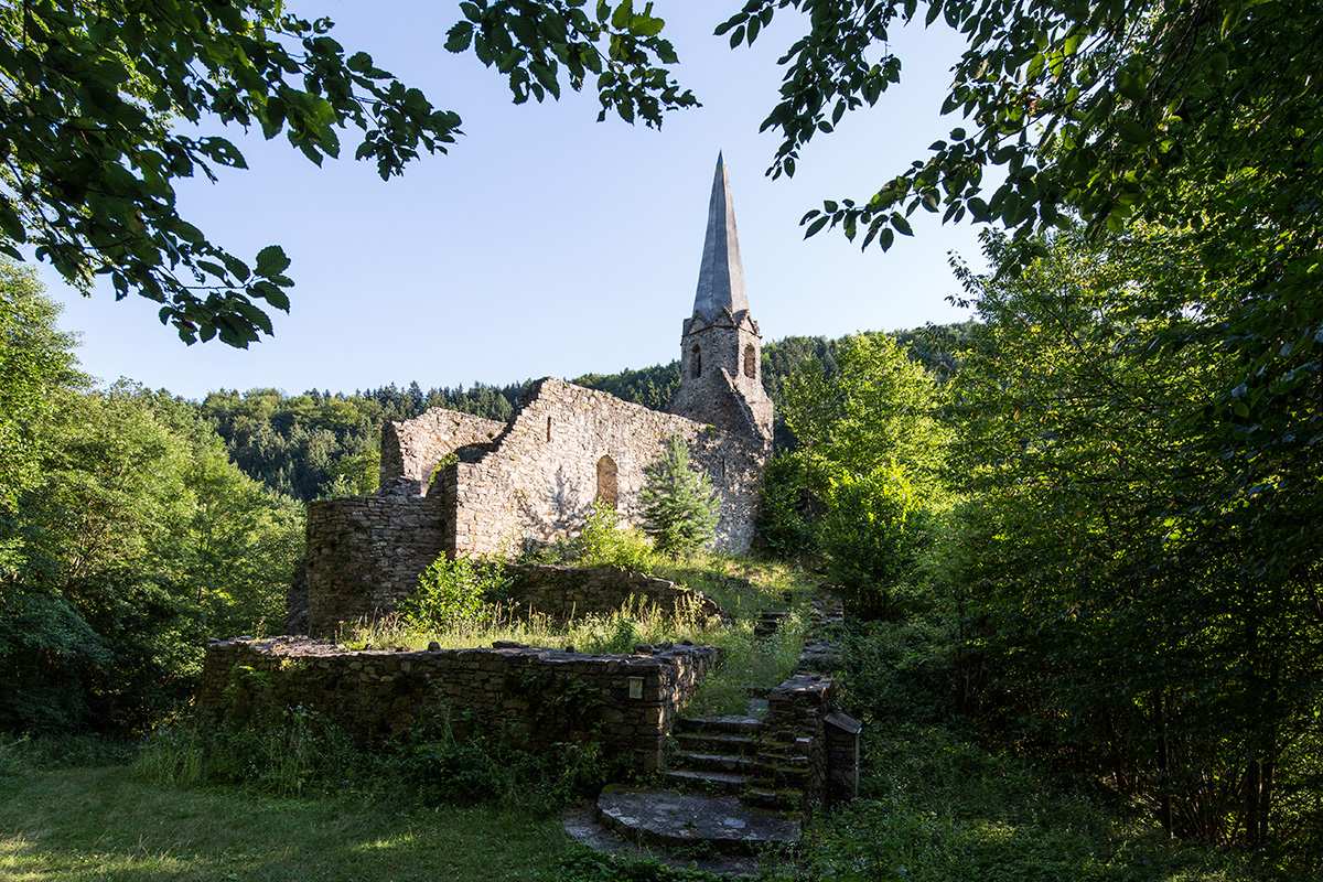 Direkt am Welterbesteig Richtung Aggsbach-Dorf liegen die Ruinen der ehemaligen Burgkapelle Gossam, die ein beliebtes Pilgerziel war. Sie wurde um 1100 als Teil einer Burganlage errichtet. Bis ins 15. Jhdt. wurde die Kirche aufgrund der großen Wallfahrertätigkeit laufend vergrößert. Heute sind nur mehr Reste der mittelalterlichen Burg vorhanden, das Kircherl ist täglich geöffnet und kann auch von innen besichtigt werden.