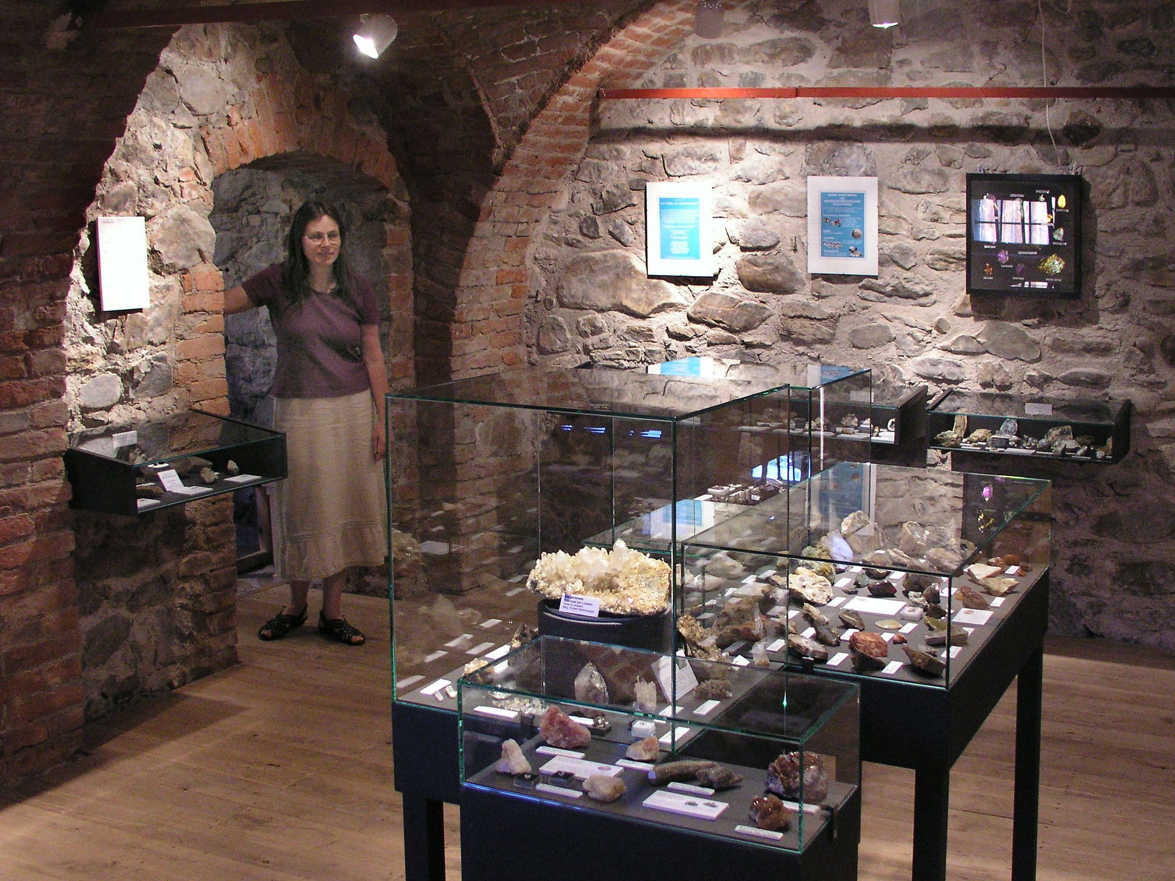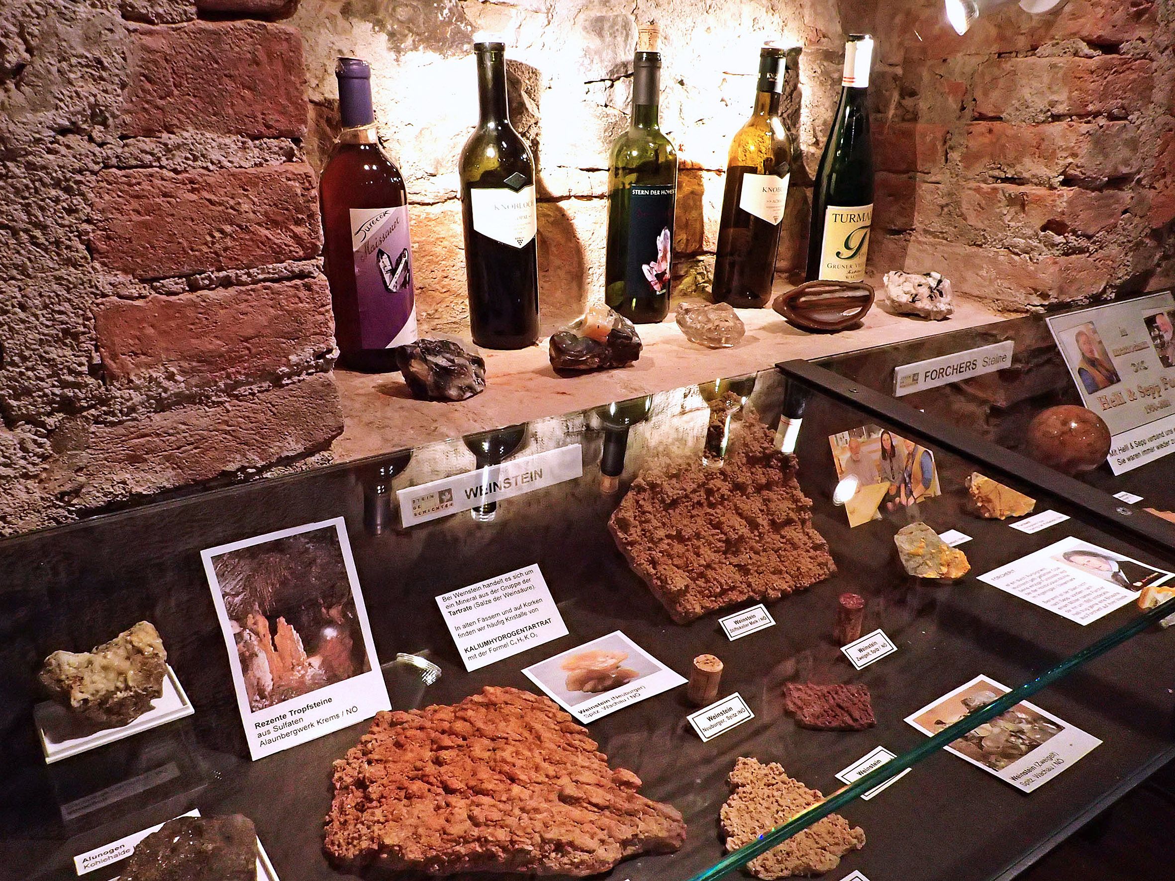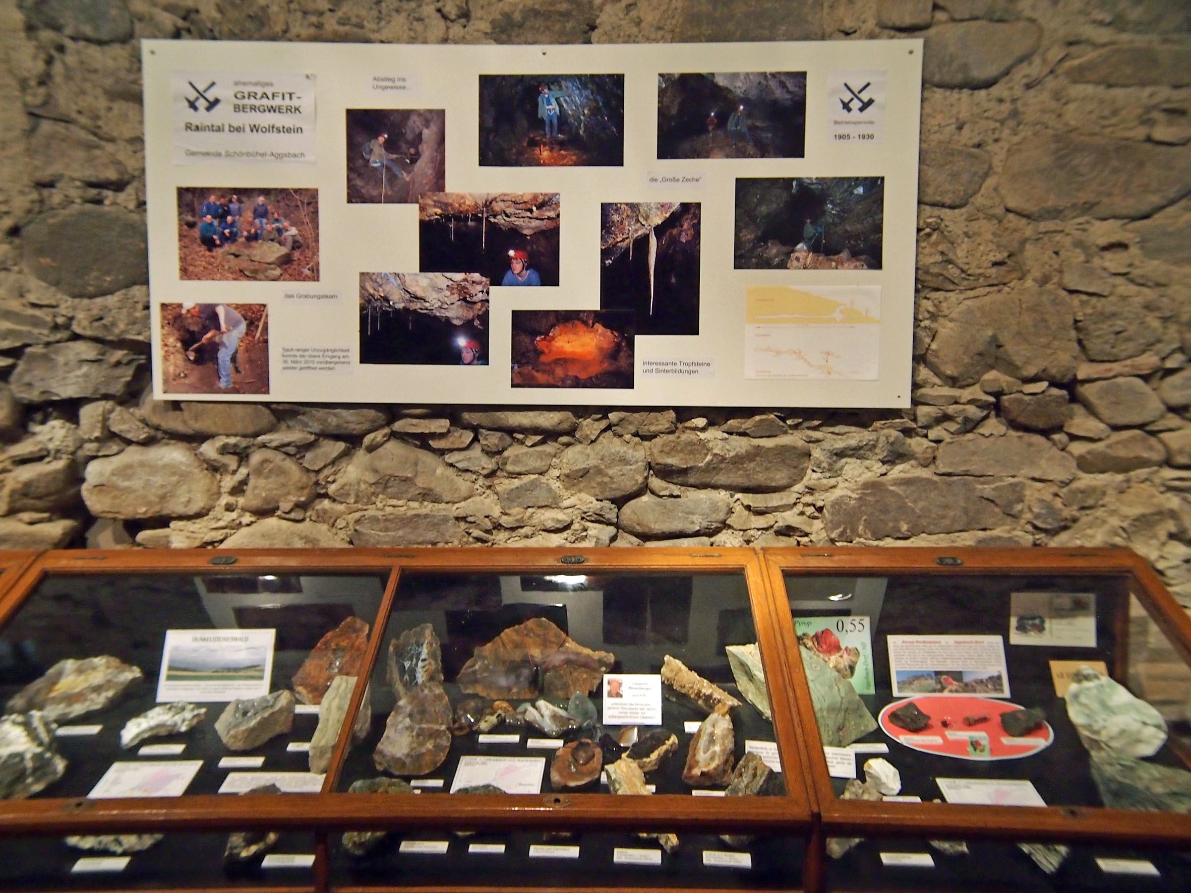 Zu sehen sind unter anderem: prächtige Opale, Amethyste und Türkise aus dem Waldviertel, funkelnde Bergkristalle aus dem Kremstal und der Wachau sowie bunte Jaspise und Achate vom Dunkelsteinerwald. Nicht fehlen dürfen die blutroten Edelstein-Granate vom Mitterbachgraben bei Aggsbach. Seltene Erze aus den Kalkalpen sowie Versteinerungen ausgestorbener Tiere und Pflanzen runden die Schau ab. Die Ausstellung wird laufend durch aktuelle Erwerbungen und Neufunde ergänzt.