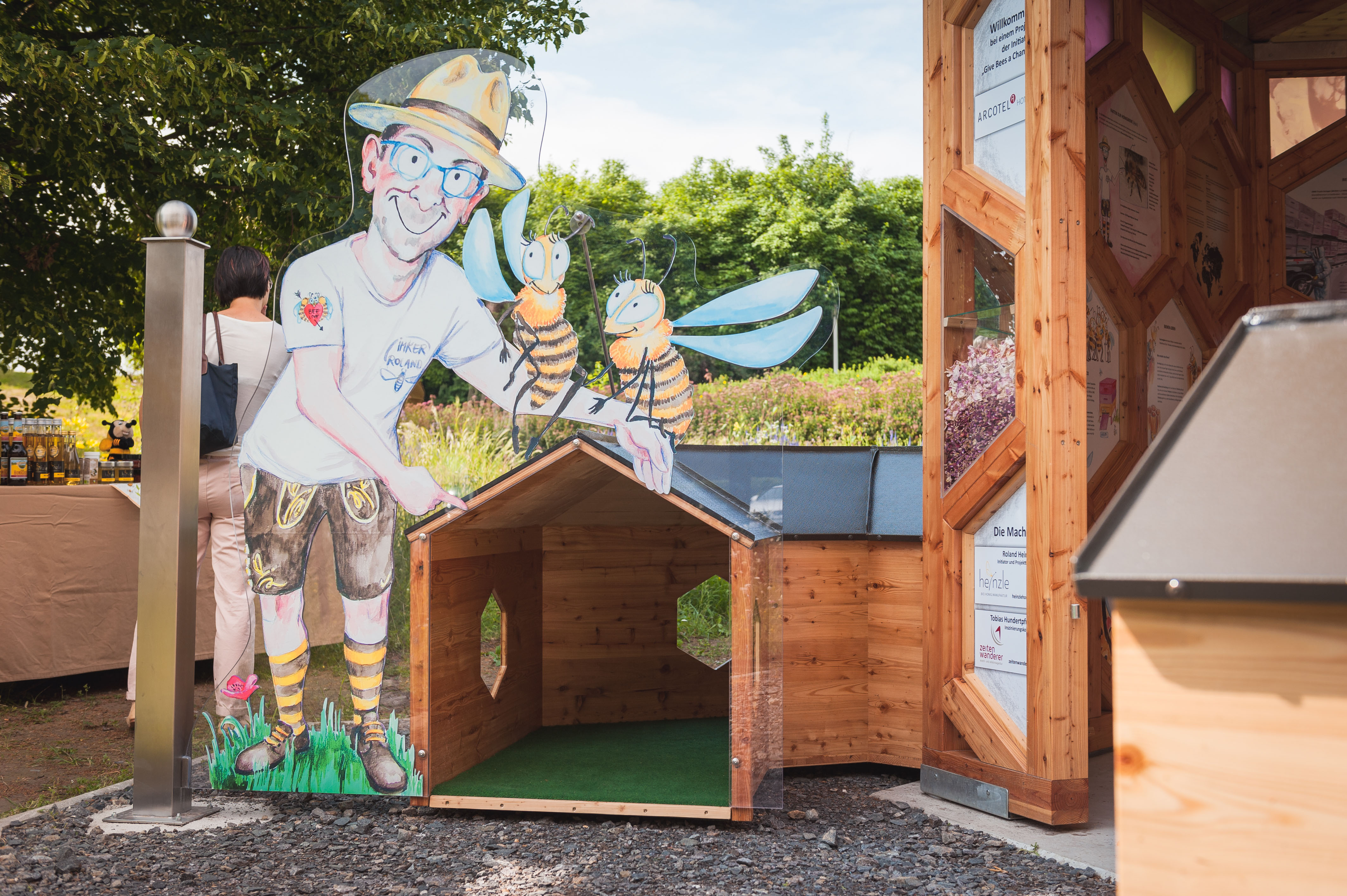 Über 20 Info- und Interaktiv-Waben im Bienenpavillon bieten auf zwei Ebenen – unten für Kinder, oben für Erwachsene – allerlei Wissenswertes, Kurioses und Interessantes zum Leben der Bienen. Wussten Sie, dass das Summen der fleißigen Bienchen von 250 Flügelschlägen pro Sekunde herrührt? Dass eine Biene das 350-fache ihres Körpergewichtes über eine ebene Fläche ziehen kann? Dass eine Bienenkönigin nur einen einzigen Ausflug aus dem Bienenstock macht, nämlich ihren „Hochzeitsflug“? Das und vieles mehr erfahren Sie im Bienenpavillon.