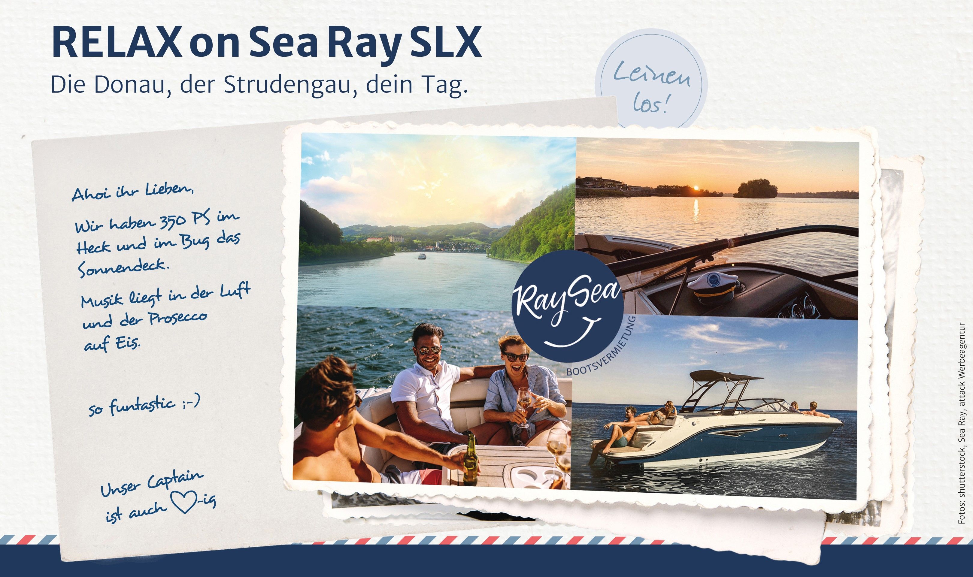 Boat on the River! Es erwartet euch die elegante SeaRay 250 SLX mit 350 PS im Heck und im Bug das Sonnendeck. Musik nach Wunsch und Laune, dazu feine Weine aus der Wachau, zum Genießen im Strudengau.