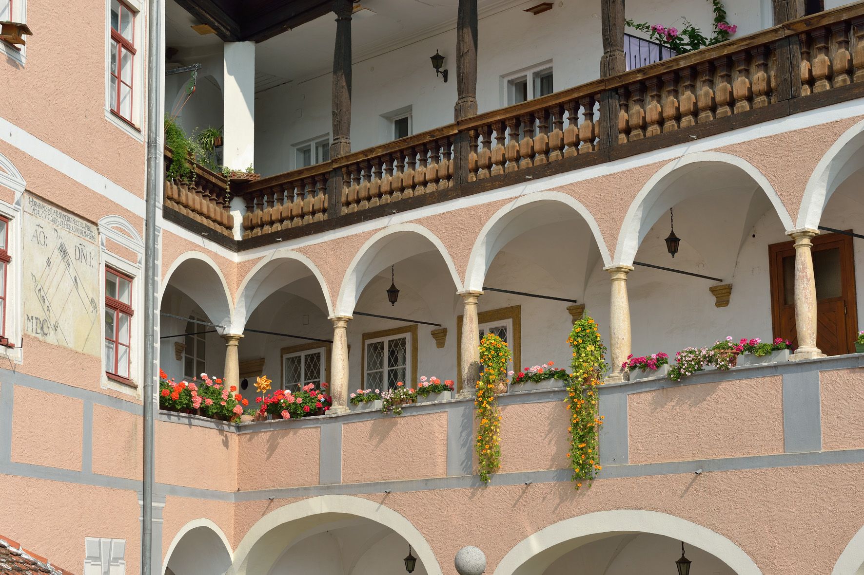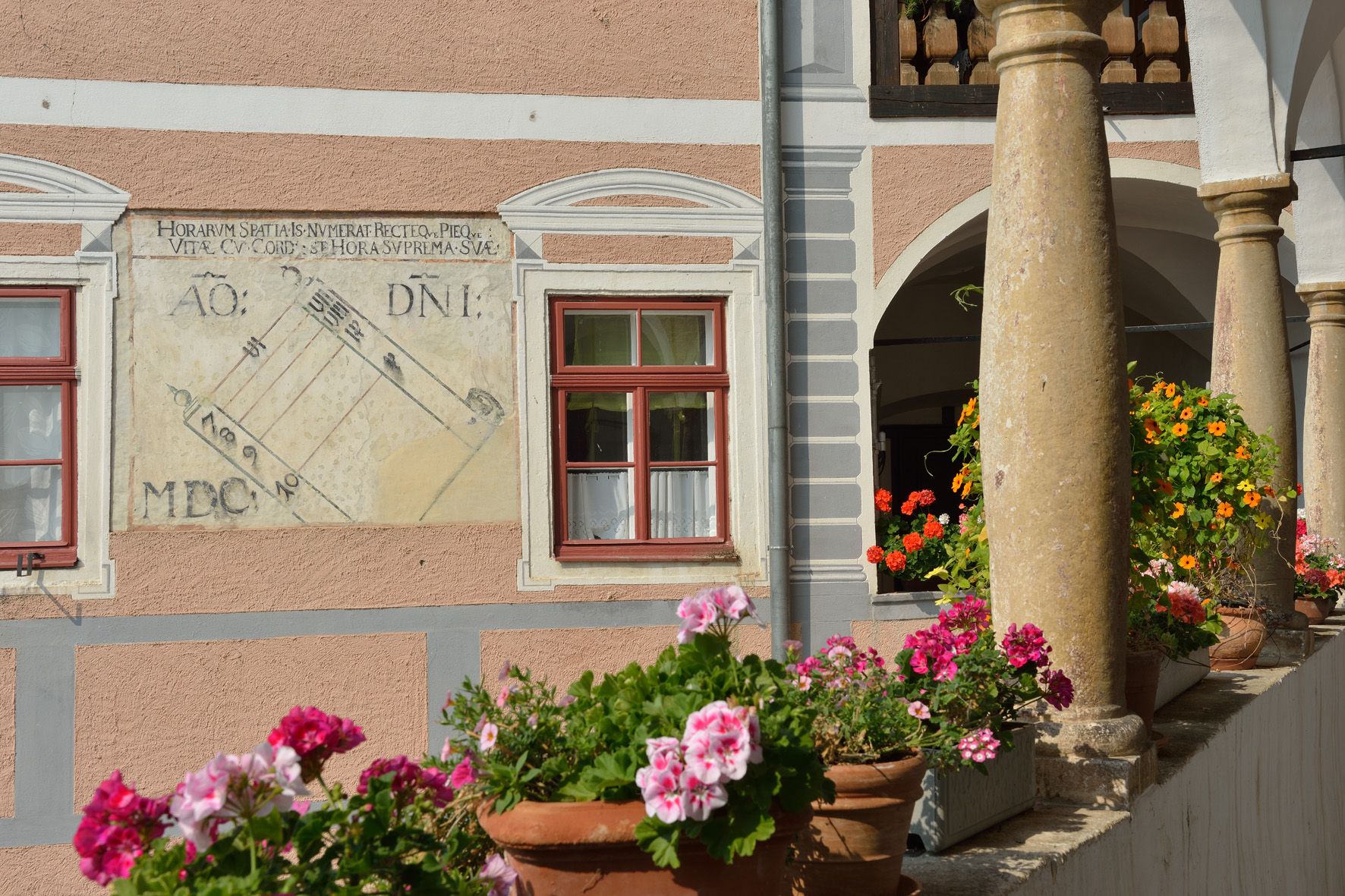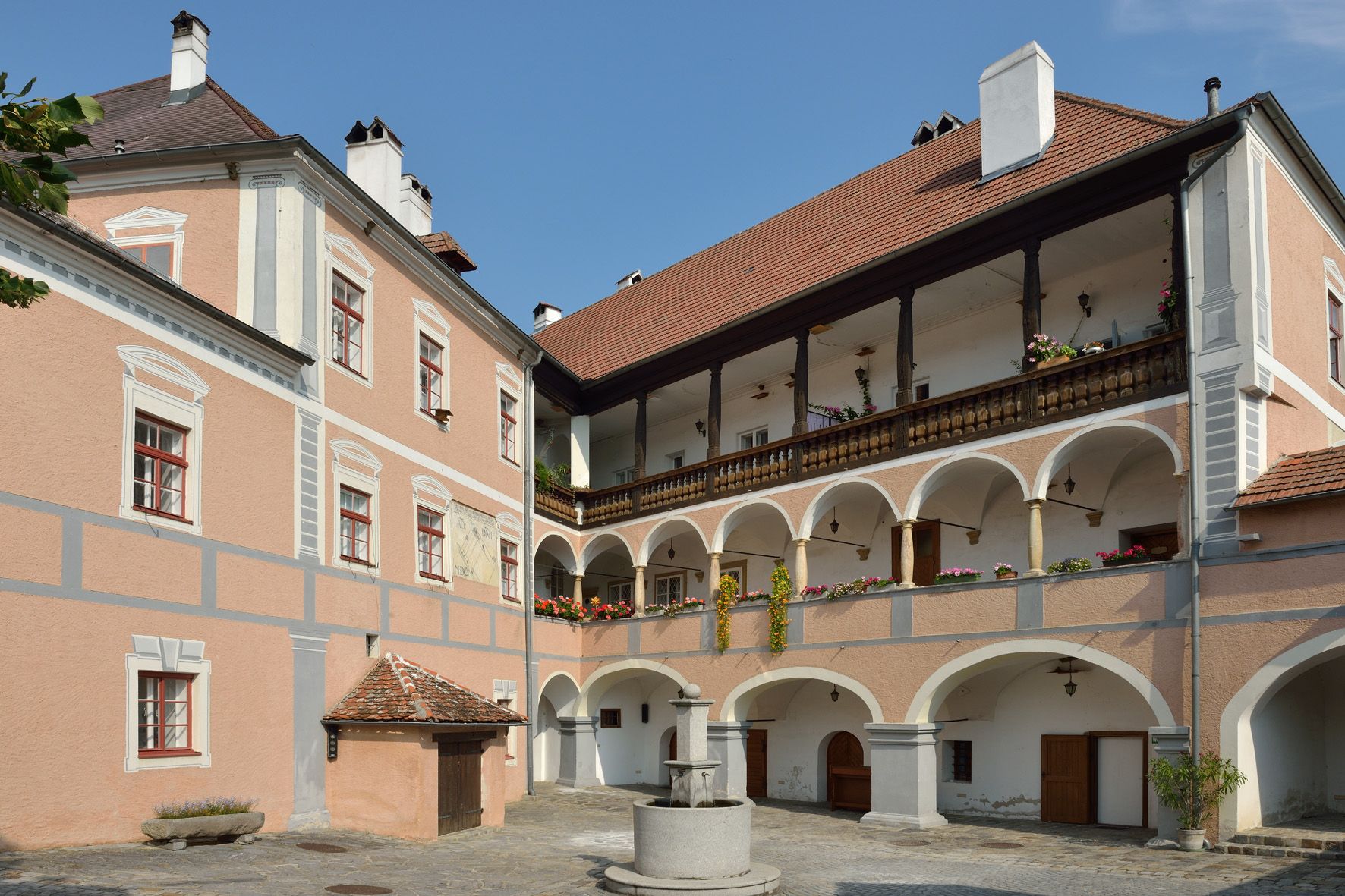Der dreieckige Innenhof ist hakenförmig von zwei Gebäudeflügeln begrenzt. Beide Flügel sind gleich lang. Jener an der Nordseite zeigt dreigeschoßige, aber verschiedenartige Arkaden, die mit einem Bogen auf den Haupttrakt übergreifen. Der Haupttrakt zeigt hofseitig eine aufgemalte Sonnenuhr, die mit 1600 datiert ist. Dieses Schloss ist seit 1859 im Besitz der Rossatzer in Form einer Agrargemeinschaft.