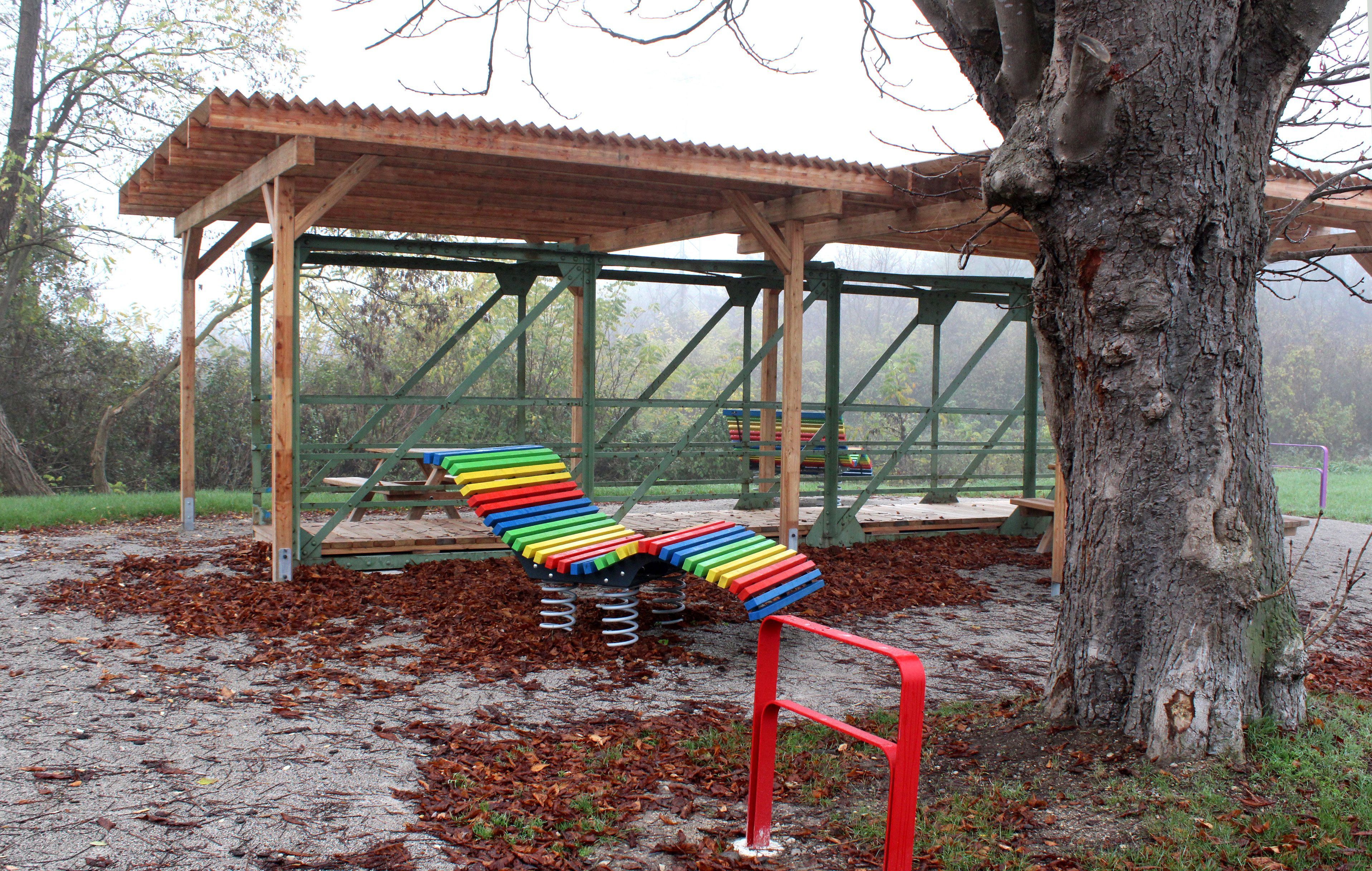 Die Schattenspendende Pergola schützt besonders an wärmeren Tagen vor der Sonne. Ebenso ist der Rastplatz mit bunten Wippliegen ausgestattet, die ein Zeichen für gelebte Vielfalt in Herzogenburg darstellen sollen.