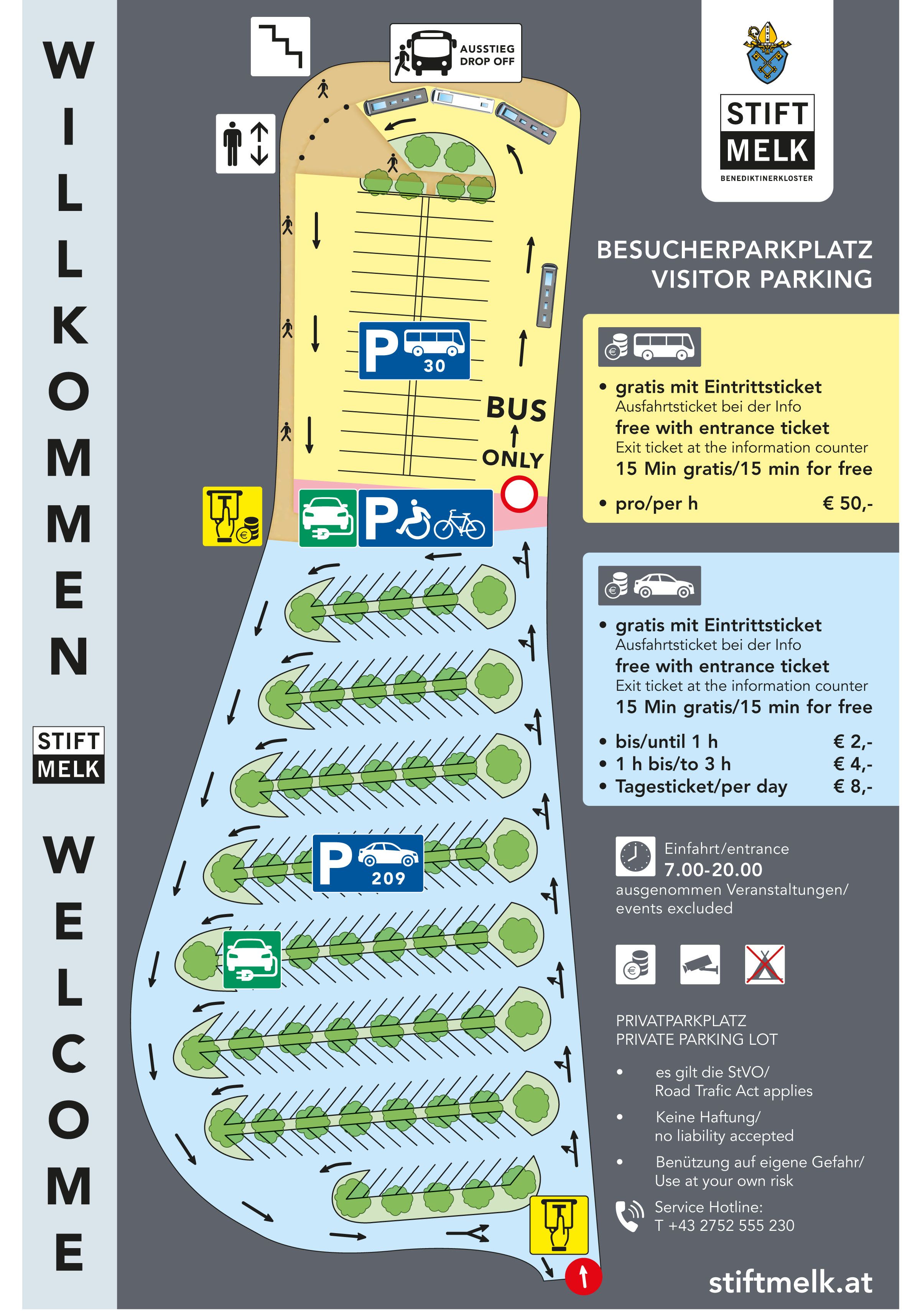 Kostenloses Parken für Busse von Reisegruppen und für Fahrzeuge von Besucher des Stiftes (mit Eintrittskarte in das Stift Melk). Das Parkticket muss beim Ticketkauf an der Kassa (erster Innenhof) entwertet werden. Innerhalb von 15 Minuten nach Ziehen eines Einfahrtstickets kann der Parkplatz ohne Bezahlung/Entwertung des Einfahrtstickets verlassen werden.
