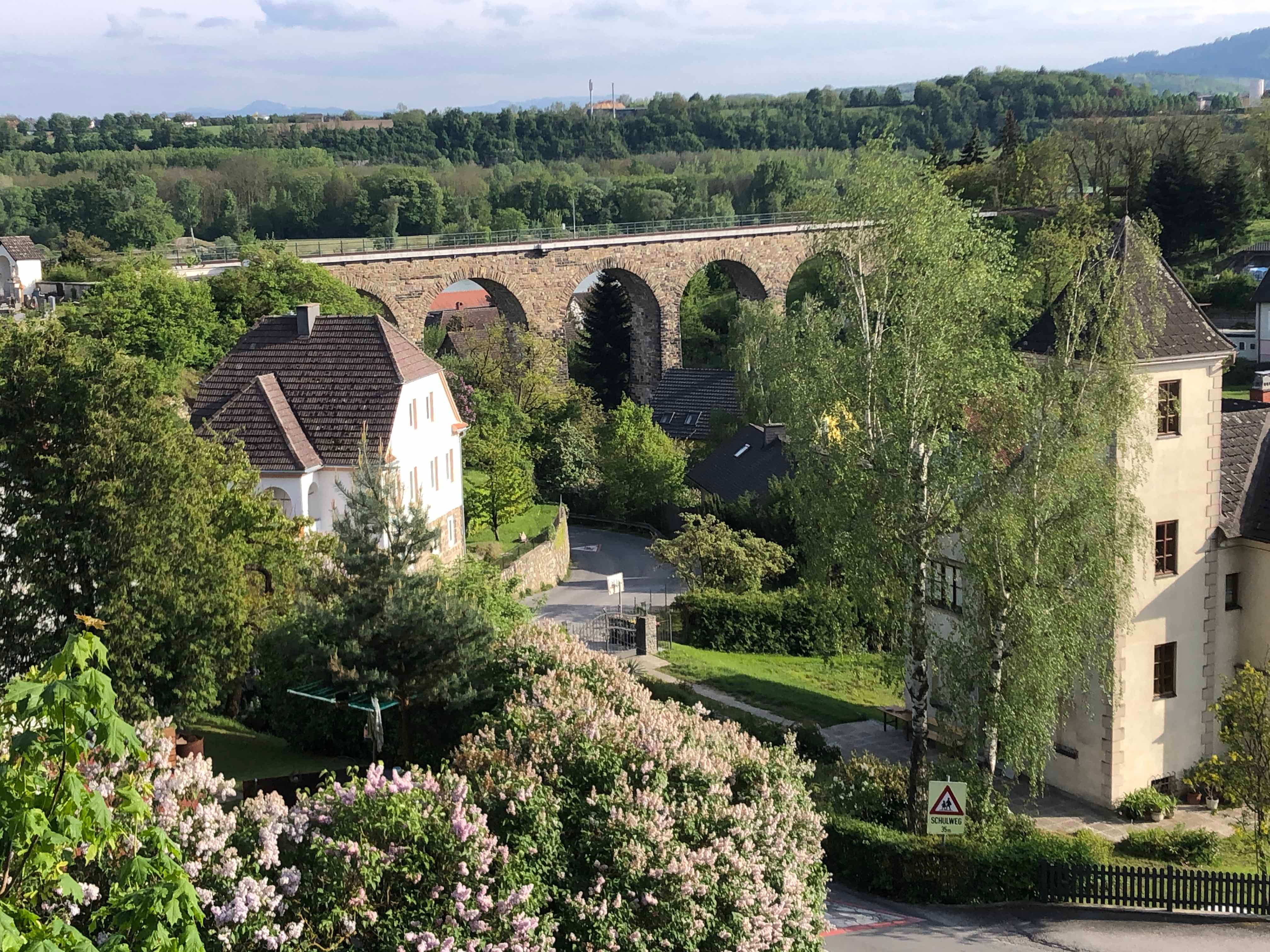 Kühn, in acht Bögen, überspannt das Viadukt die Ortsstraße von Emmersdorf. 105 Meter lang und über 100 Jahre alt. Seit 1909 verlief hier die Donauuferbahn, auf der Dampfloks Mensch und Material zwischen Krems und St. Valentin transportierten.