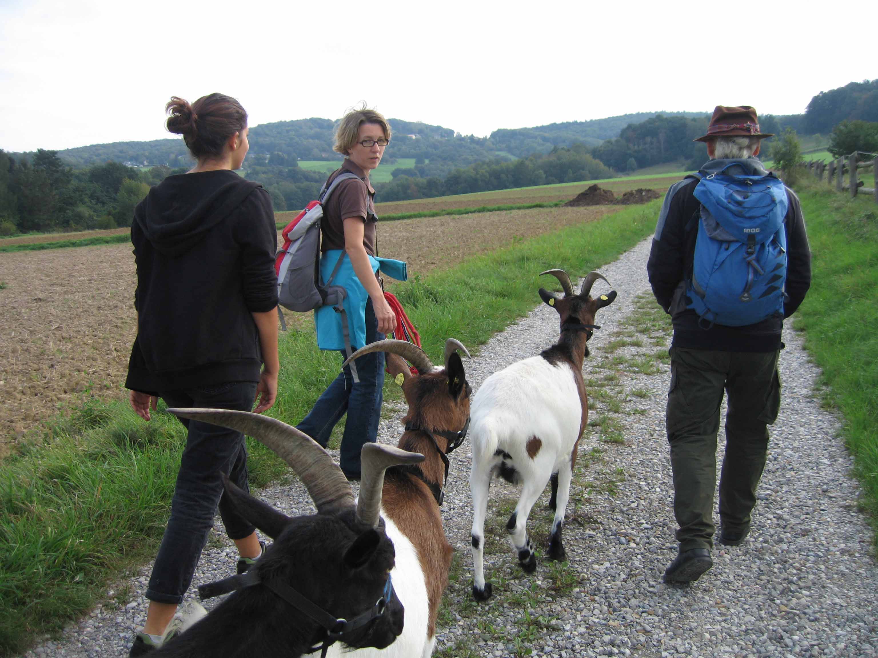 Ablauf einer Ziegenwanderung: Die Teilnehmer lernen die Ziegen kennen und bekommen wichtige Tipps für die bevorstehende Wanderung. Danach geht es auf in den umliegenden Wienerwald.