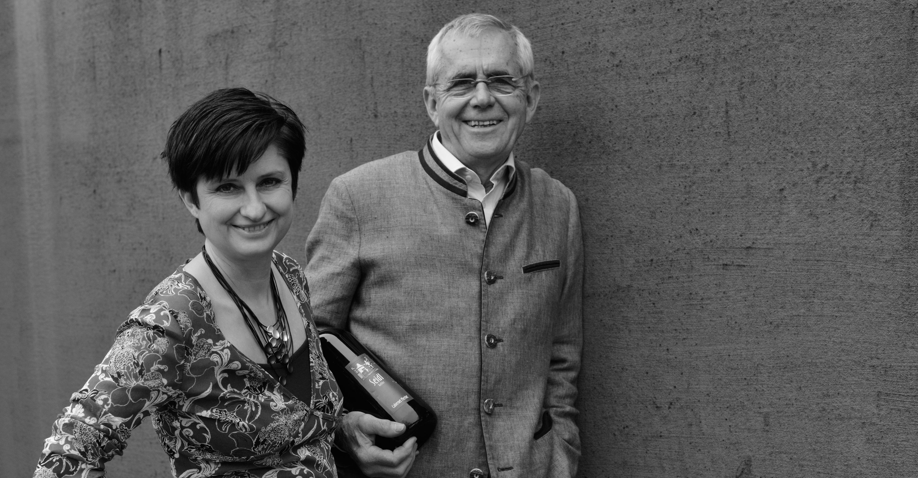 Ein Mann und eine Frau stehen lächelnd vor einer Wand. Der Mann hält eine Weinflasche.