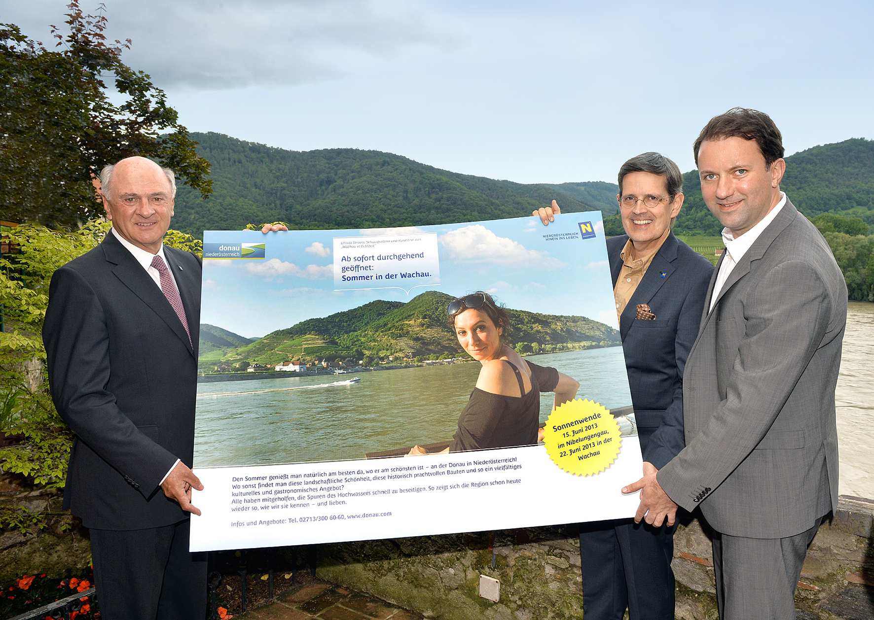 St. Pölten, 12. Juni 2013. "Ab sofort durchgehend geöffnet: Sommer in der Wachau", steht auf dem Plakat, das die Schauspielerin und gebürtige Pöchlarnerin Ursula Strauss zeigt. Die Botschaft ist damit klar und unmissverständlich: Die neue Kampagne soll Lust auf die Donauregion in Niederösterreich machen. "Die meisten Tourismusbetriebe sind geöffnet und erwarten ihre Gäste. Ziel muss jetzt sein, möglichst rasch wieder Ausflugs- und Urlaubsgäste in die Region zu bringen. Jeder Gast, der in die Donauregion kommt, hilft mit, die Folgen des Hochwassers zu überwinden. Mit einem kurzfristig umgesetzten und umfangreichen Maßnahmenpaket werden wir der verhaltenen Nachfrage gegensteuern", sagt Landeshauptmann Dr. Erwin Pröll und fügt weiters hinzu: "Besonders freut es mich natürlich, dass Ursula Strauss dankenswerter Weise die Patronanz übernommen hat."