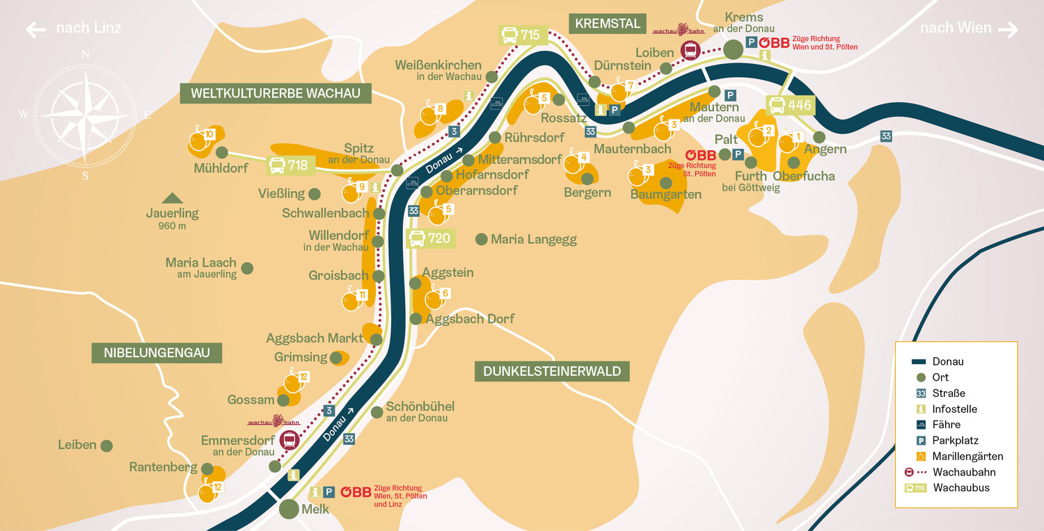 Die VOR-Buslinien 715 nördlich der Donau und 720 südlich der Donau verkehren in regelmäßigen Intervallen zwischen Krems und Melk - beides Städte, die mit dem Zug gut erreichbar sind - und halten in allen größeren Orten der Wachau. Die Wachaubahn startet ab 15. März in die neue Saison und fährt bis 30. April an Samstagen, Sonn- und Feiertagen. Von 1. Mai bis 2. November verkehrt sie täglich.