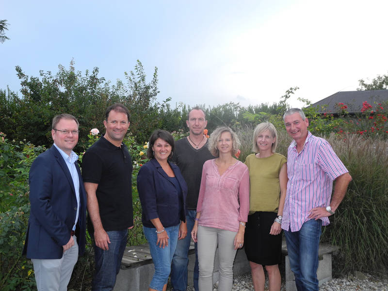 Foto vlnr: Franz Aigner - Obmann der Region Wagram, Mag. Bernhard Schröder - Geschäftsführer der Donau Niederösterreich Tourismus GmbH, Sabine Schwinn - Regionalbetreuerin der Donau Niederösterreich Tourismus GmbH, Gartenfestwochen-Initiator Xandl Schmidhammer, Mag. Karin Rinderhofer - Gruppenleiterin Stadtmarketing der Stadtgemeinde Tulln, Dipl.Ing. Agnes Feigl - Projektkoordinatorin im Auftrag der Donau Niederösterreich Tourismus GmbH, LKR ÖK.Rat Rudolf Friewald - Bürgermeister der Gemeinde Michelhausen.