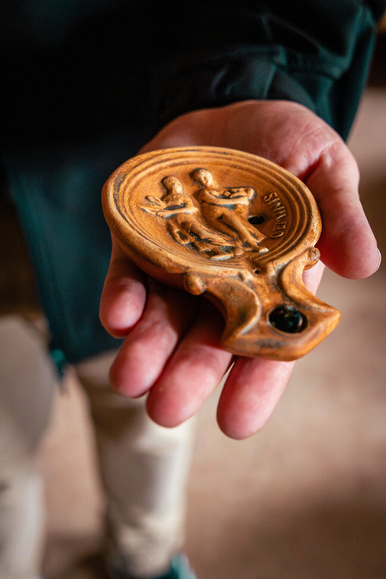 Einen wohligen Geruch verströmte dagegen mit Sicherheit das römische Pfannenbrot, das zum Beispiel Schulklassen bei einer Führung vor Ort probieren können. Flavius Kyrill Blume hat das Rezept auch fürs Nachbacken zuhause verraten: Man mischt Weizen- mit Dinkelmehl, italienischen Kräutern und ein wenig Salz (das war damals teuer!). Dann kommt noch etwas kaltes Wasser dazu und schon kann der Teig mit Olivenöl geknetet werden und in der Pfanne ausgebacken werden. Apropos Olivenöl: „Das war überhaupt die Wunderwaffe der Römer“, findet Ruth Lößl-Brousil. „Sie benützten es auch für ihre Öllämpchen, die überall im Haus Licht spendeten.“