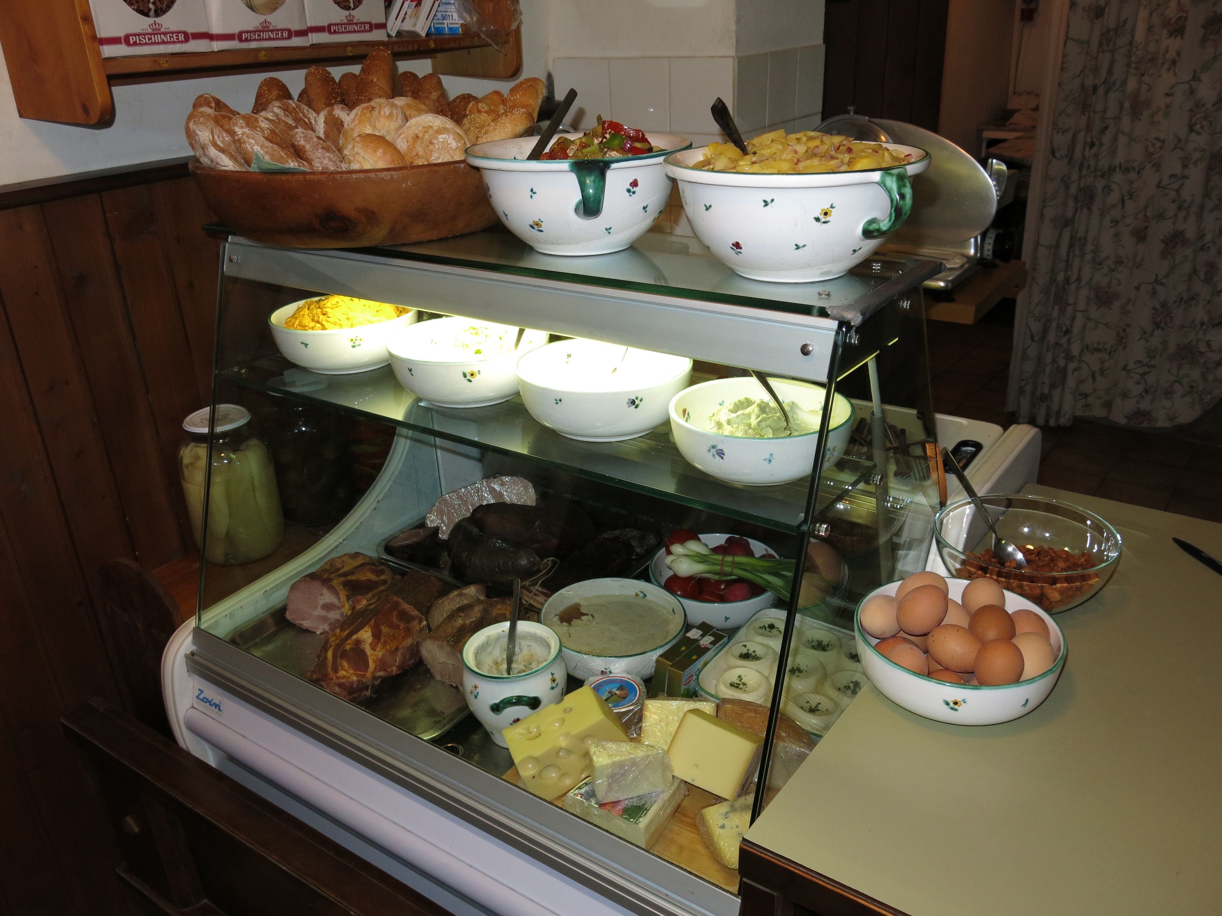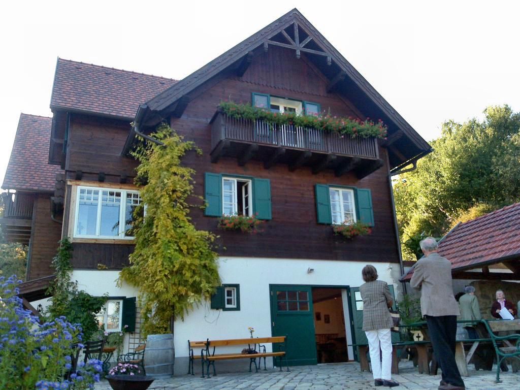 In our buffet we offer a lot of homemade food that goes well with our wines. In the garden our guests sit under large shady trees. There is space for our youngest guests to play and run around on a lawn right next to the tables. If the weather is not so good, our guests can sit in our Heurigenstube, which seats about 50 people.