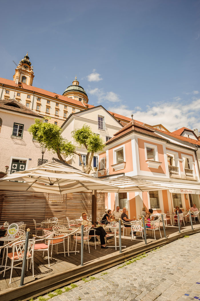 ie Gäste genießen Café und Mehlspeis’ in stilvollem Ambiente vom Spiegelzimmer bis zum grünen Teesalon – und sommers gerne im großen Gastgarten direkt an der Fußgänger-zone, um dabei das pulsierende Leben der Melker Altstadt zu beobachten.