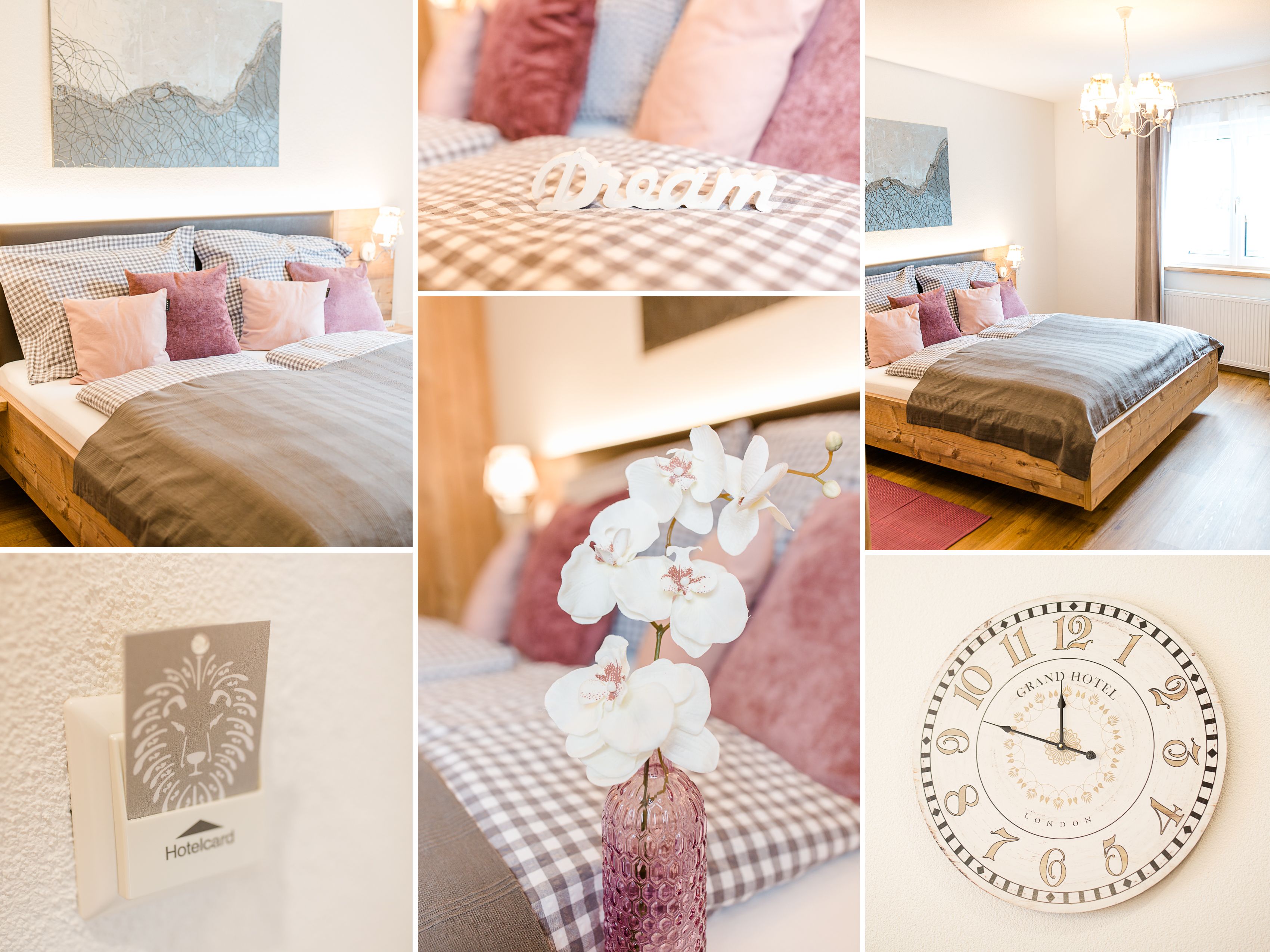 Gemütliches Bett mit grüner und karierter Bettwäsche, dekoriert mit Kissen und einem 'Dream'-Schriftzug.