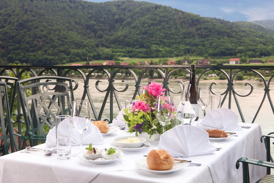 Unter Schatten spendenden Kastanienbäumen bietet sich ein herrlicher Blick auf die vorbeiziehenden Schiffe, den barocken Stiftsturm sowie die Burgruine Dürnstein. Kulinarische Köstlichkeiten und eine erlesene Auswahl von Spitzenweinen aus der Wachau und anderen österreichischen Weinbaugebieten runden das gastronomische Erlebnis ab.