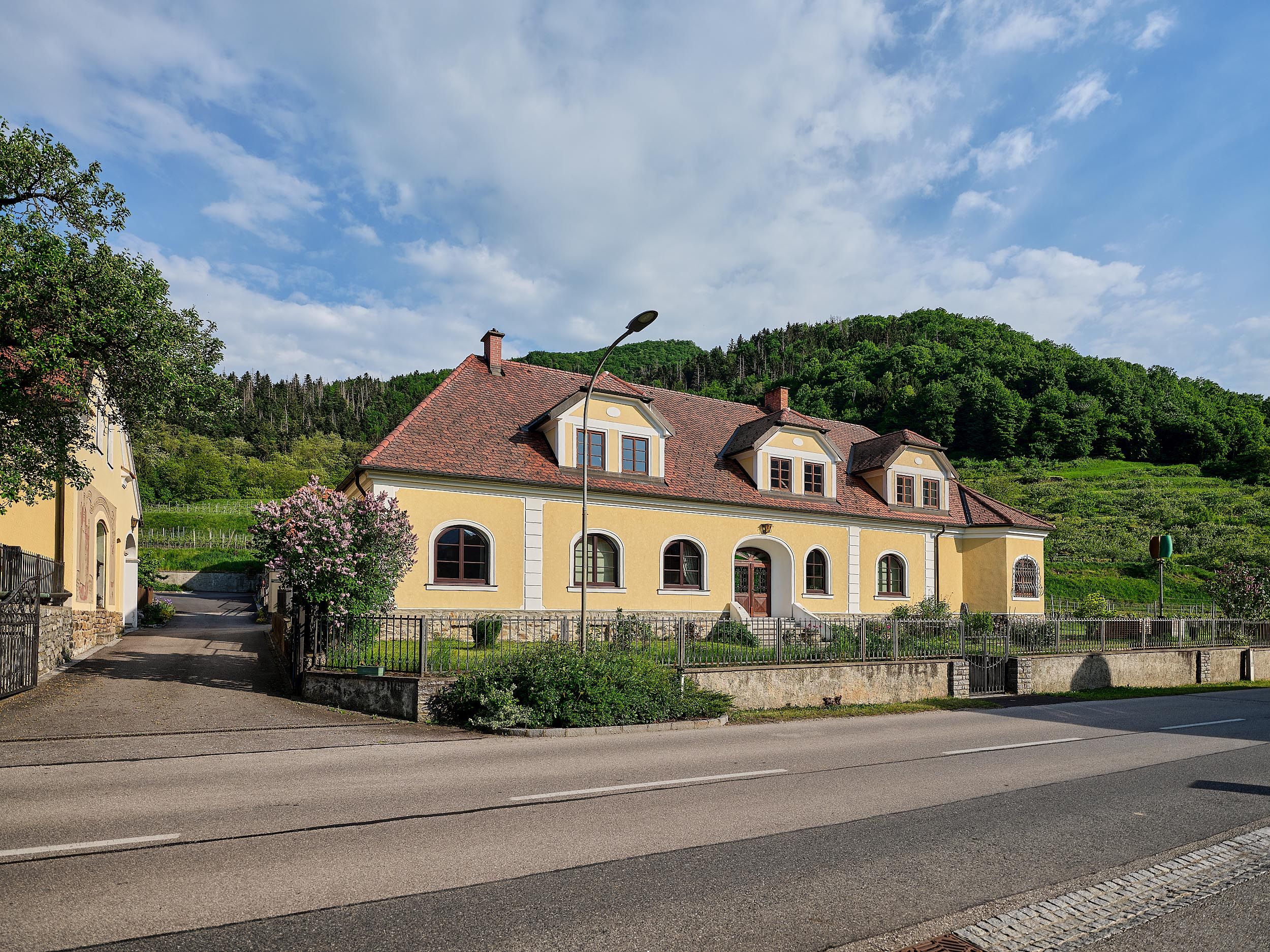 Das Weingut Maria Hick, eingebettet in malerische Weingärten, bietet einen atemberaubenden Blick auf die Donau und die Burgruine Hinterhaus. Die ruhige, sonnige Lage lädt zur Entspannung ein.
