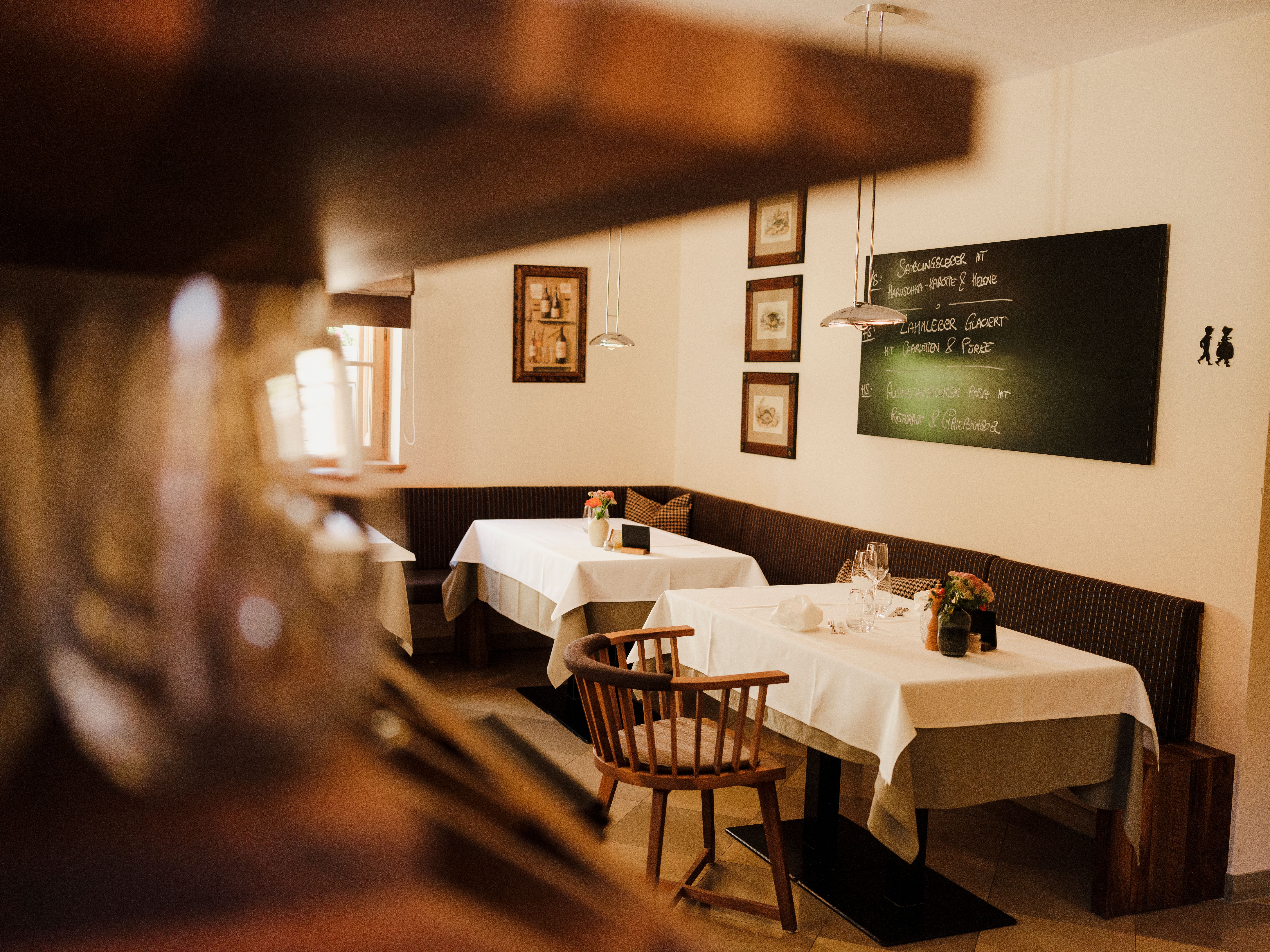 Der Weg vom rückseitig am Haus gelegenen geheimen Garten in den Gastraum führt durch jenes Warenlager, in dem sich Mitte des letzten Jahrhunderts ein Kino befand, vorbei an der Küche, die früher Josefs Schlafzimmer war. Dann stehen wir mittendrin in der Stube. „Die Schank haben wir bewusst in der Mitte des Raums platziert, auch wenn das schlecht ist für die Akustik“, verrät der Wirt. „Lieber mache ich ein bisschen weniger Umsatz und habe stattdessen einen Ort der Begegnung.“ Weil es außer ihm in Langenlebern kein weiteres Gasthaus mehr gibt, sollen sich alle willkommen fühlen, die Jungen und Alten, die Kartenspieler:innen und Stammtischler:innen, Stammgäste und Neulinge. Für die Einheimischen hat er sich etwas Besonderes einfallen lassen, eine separate Toilette. Auch da ist sozusagen: alles im Fluss.