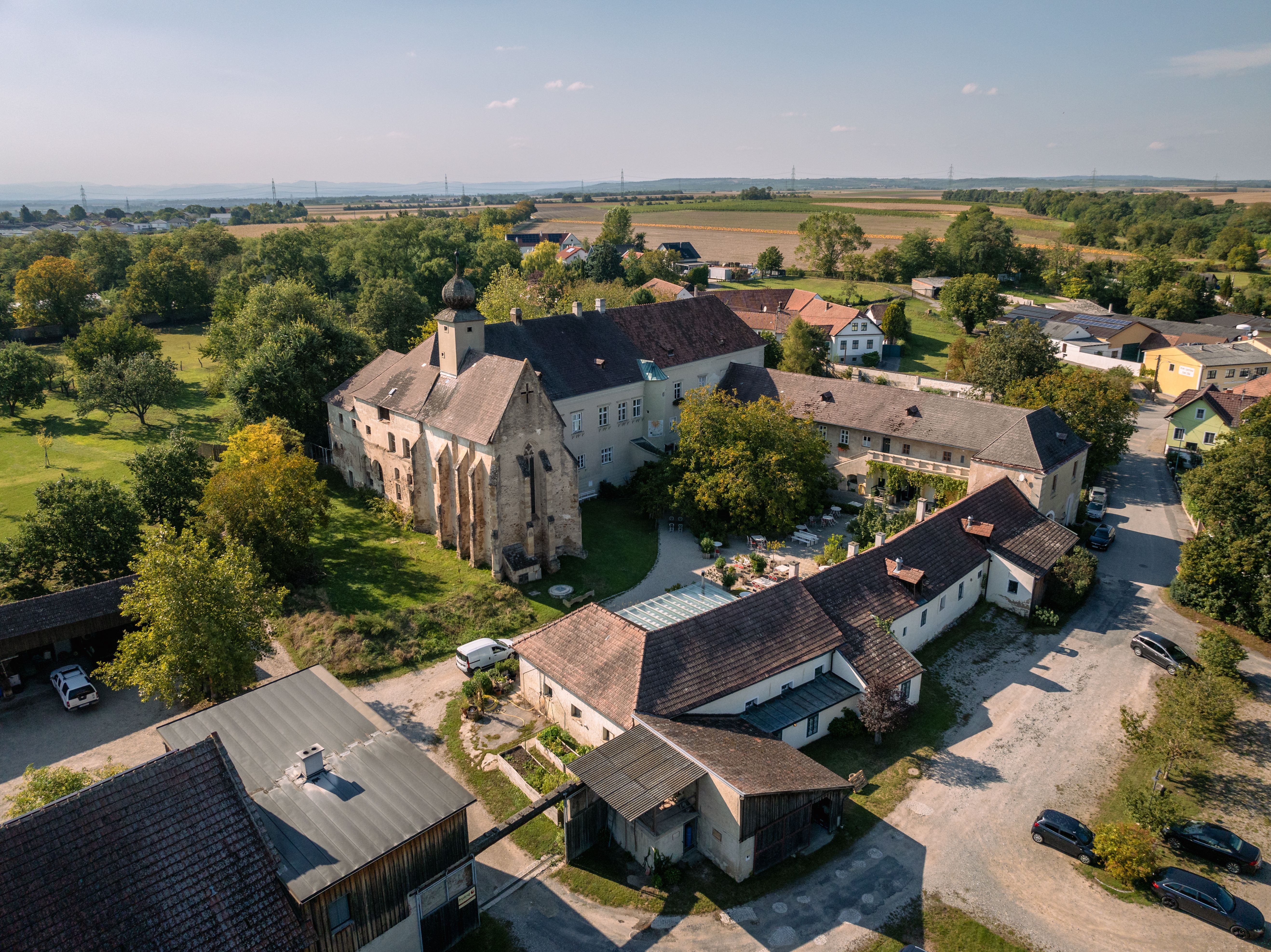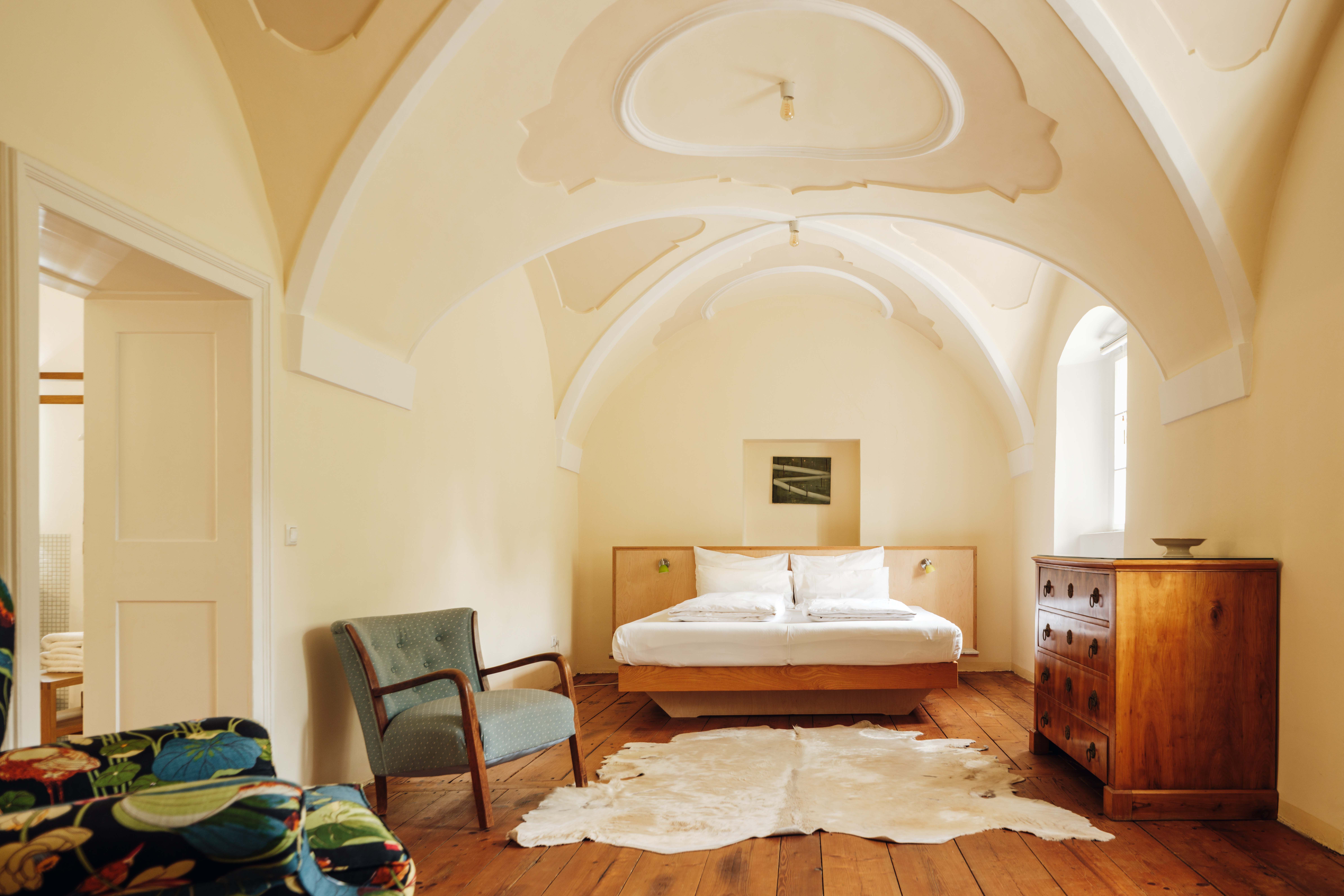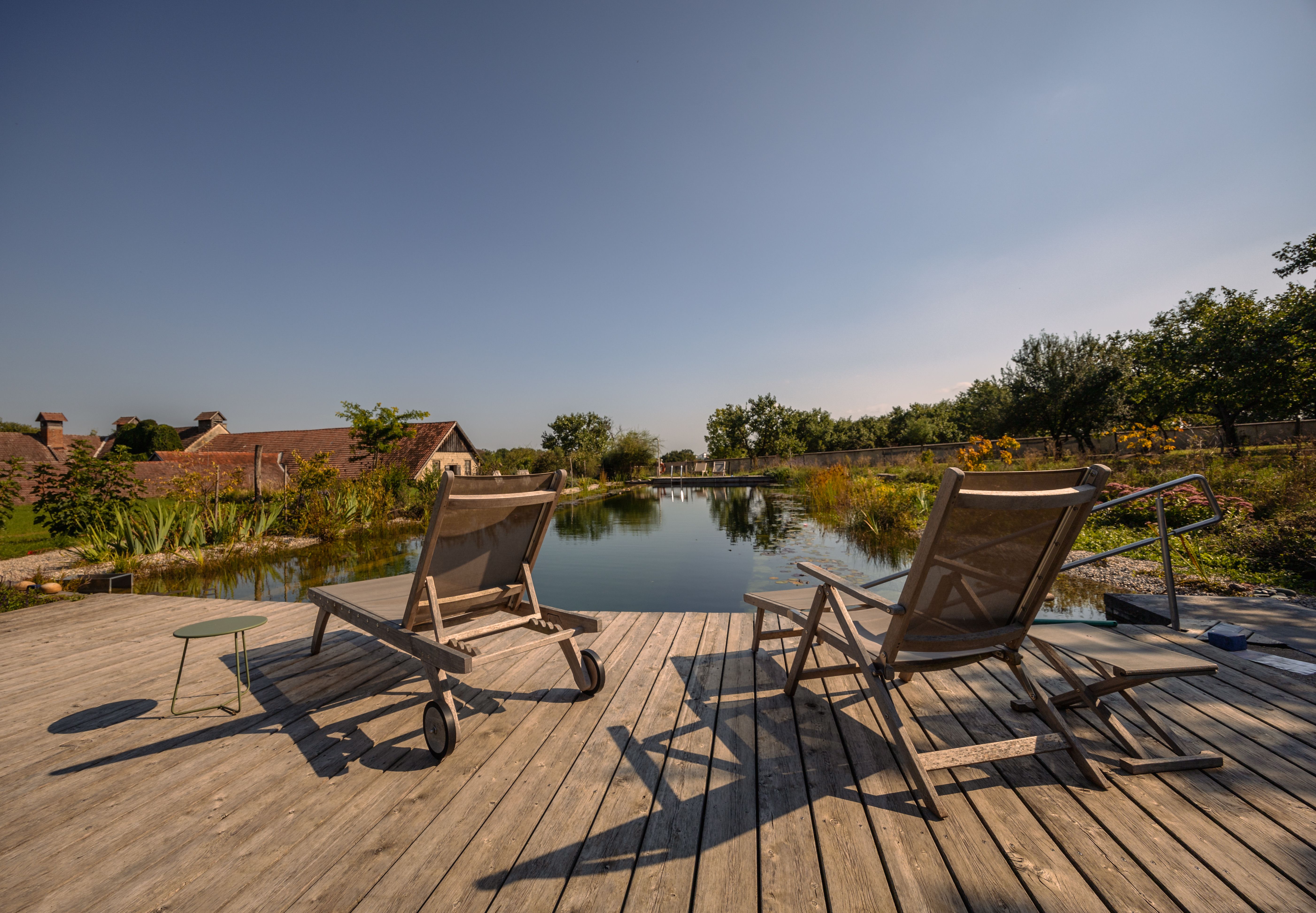 Fritz‘ Ehefrau Birgit, deren grau-braun-melierte Haare zu einem Dutt hochgesteckt sind, kümmert sich um die sieben auffallend geschmackvollen Gästezimmer. Fünf davon befinden sich im auf das 15. Jahrhundert datierte Haupthaus. Spitzbögen, massive Holztüren, barocke Möbel und stuckverzierte Gewölbe können schnell überfordernd wirken, nicht so hier, wo der Spagat zwischen skandinavischem Minimalismus und historischer Gemütlichkeit gelingt. Das Frühstück mit vielen hausgemachten Produkten wird im ebenerdig gelegenen Tonnengewölbe serviert. Hausgäste dürfen sich frei auf dem drei Hektar großen Gelände bewegen. Dazu gehört ein betörend blühender Garten, wo Holzliegen zum Nichtstun einladen und an dessen Kirschbäumen man sich gerne bedienen darf. Nicht zu vergessen der fünfundzwanzig Meter lange, von Wildblumen umwachsene, in den Lehmboden gegrabene Schwimmteich. Wer dort seine Bahnen zieht, hat die Kapelle ebenso im Blick wie das dahinterliegende Wirtschaftsgebäude.