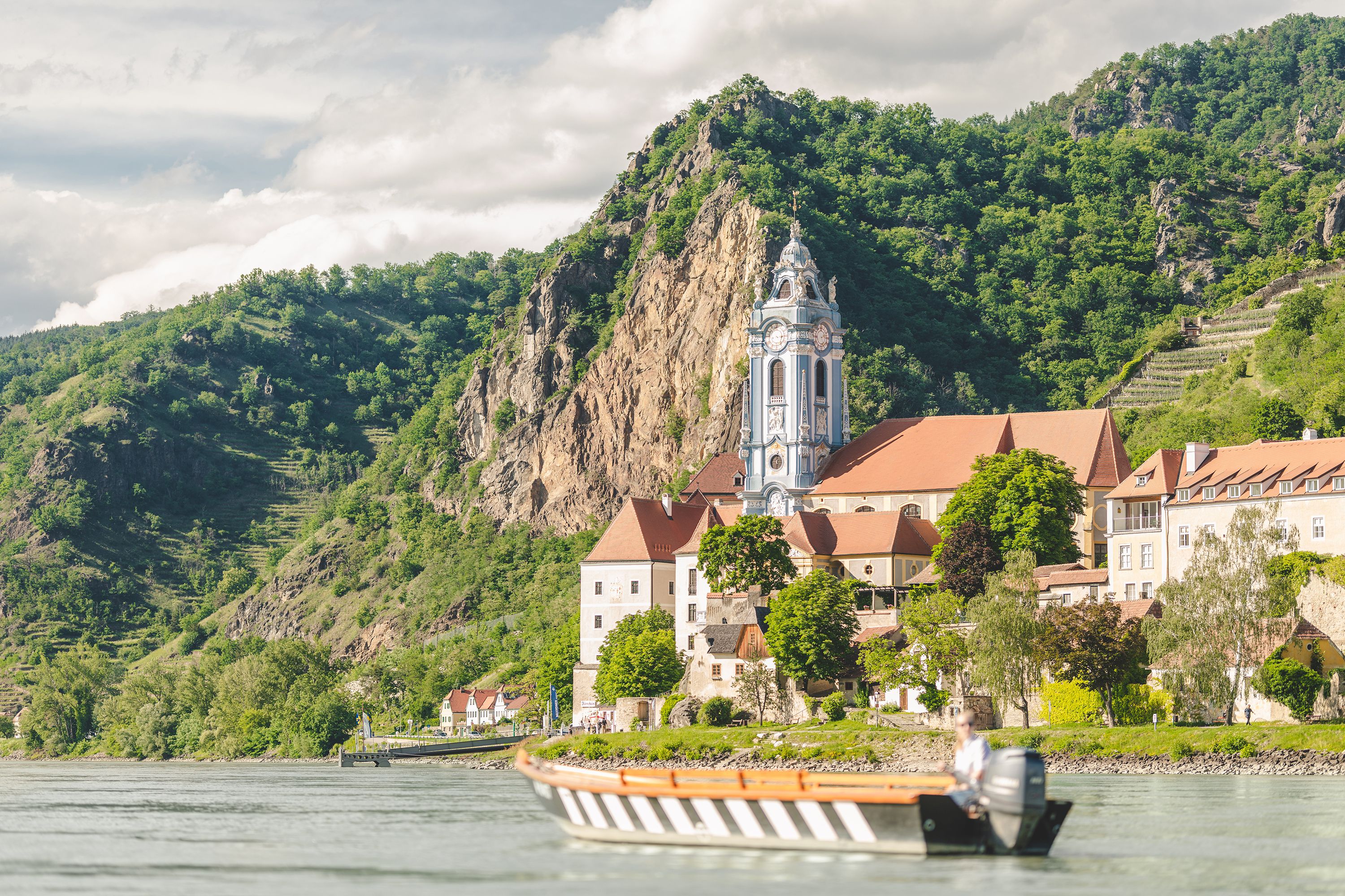 Der Blick von der Restaurant-Terrasse des Schlosshotel Dürnstein auf die Donau ist legendär. Von ganz oben am Felsen, wo es thront, schaut man übers Wasser und zur anderen Uferseite. Für Thiery gibt es aber einen Ausblick, der mindestens genauso spektakulär ist, wenn nicht noch spektakulärer: Den Blick von der Donau ans Ufer, am besten von einer Zille aus – mit der man so nahe am Wasser ist, wie es nur geht, ohne nass zu werden.