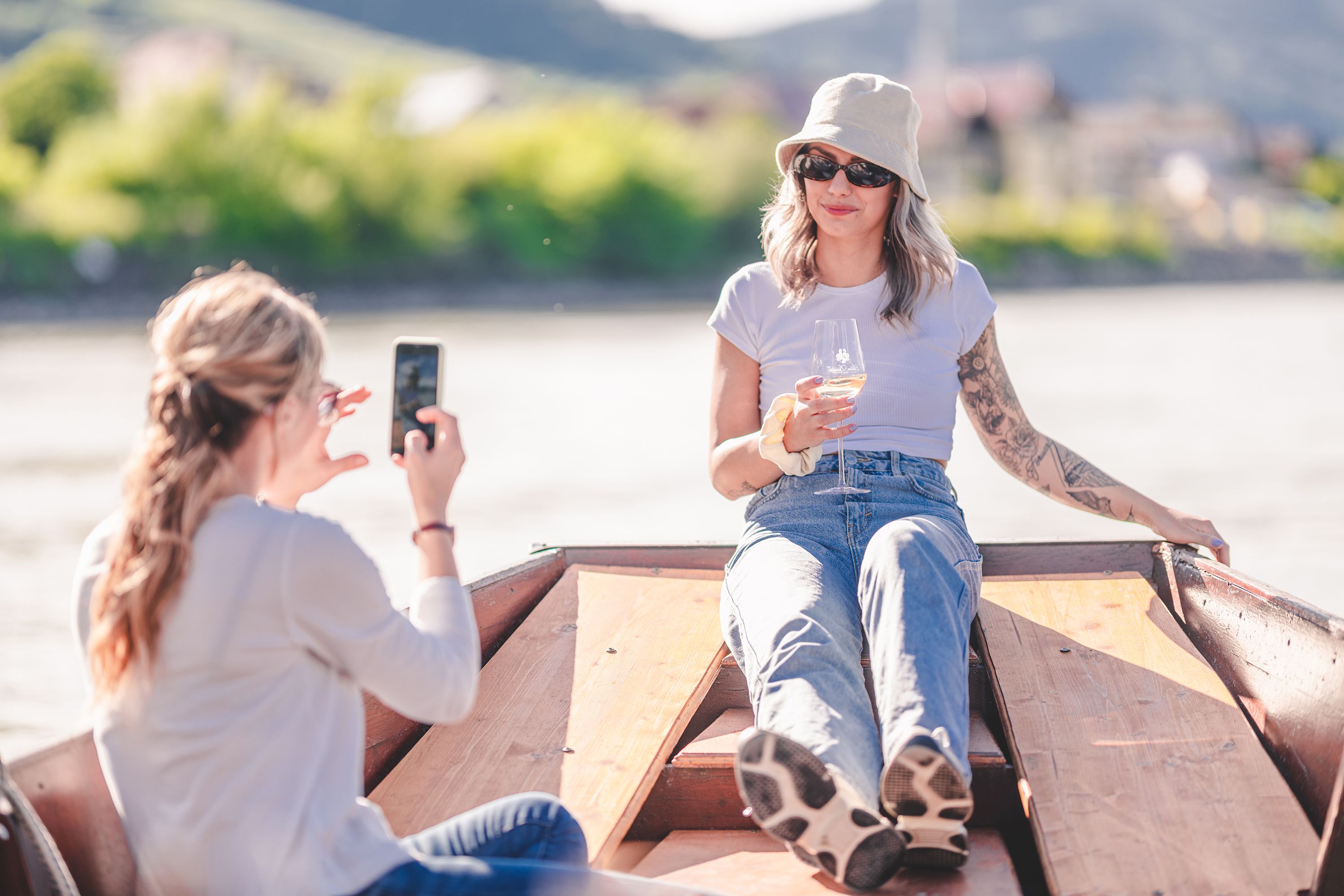Während der Fahrt mit der Zille gibt es die Vorspeise, Kleinigkeiten im Glas, feine Häppchen, wo immer möglich aus Produkten aus der Region. Ja, auch die Marille kommt vor. Dazu ausgewählte Spitzen-Weine. Während man sie trinkt, fährt man teilweise direkt an den Hängen vorbei, auf denen die Trauben einst gewachsen sind. Dazu weiß der Kapitän jede Menge interessante Geschichten zu erzählen. Diesen unverstellten Blick auf die Weinberge und die Landschaft des schönsten Stückes der Wachau gibt es nur direkt von auf der Donau aus. Nicht einmal am Donauradweg und schon gar nicht von der Straße aus.
