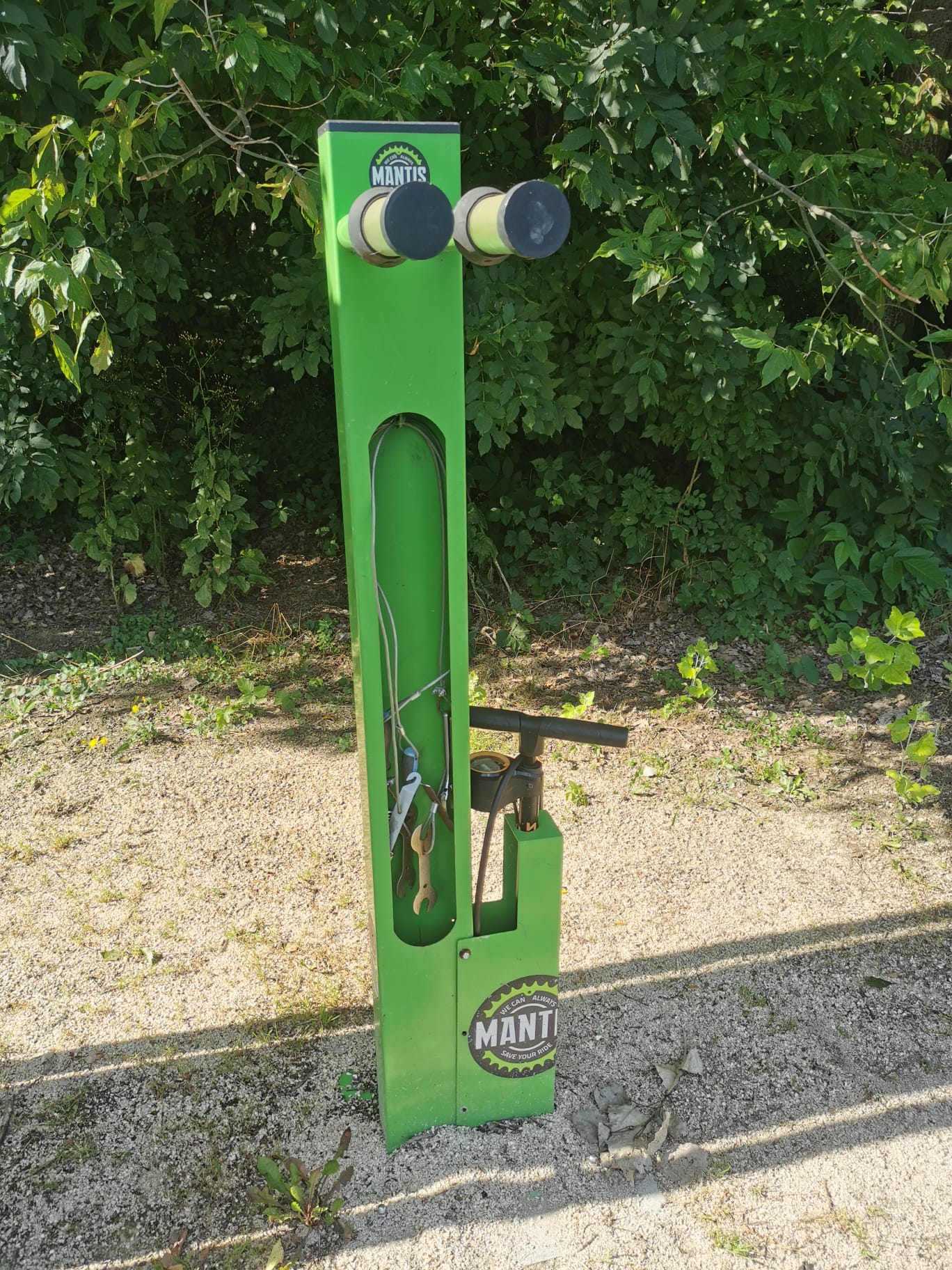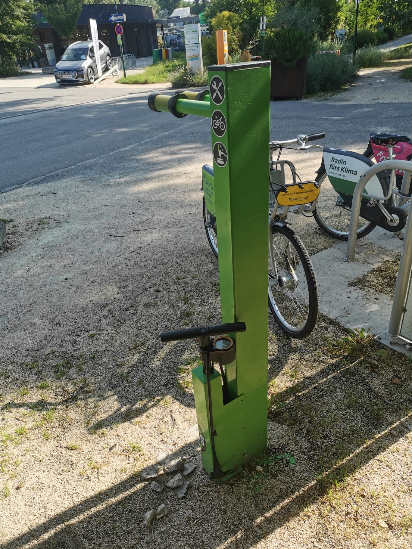 Die Rad Service Station vor dem Eingangsgebäude der Gartenerlebniswelt DIE GARTEN TULLN ist ausgestattet mit Luftpumpe und Werkzeugen die servicebedürftigen Fahrrädern rasch zu Hilfe kommen.