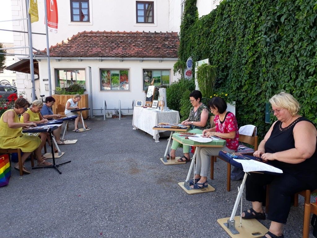 Lasst uns gemeinsam klöppeln, Nadelspitze nähen und Occhi-Spitze knüpfen. Der Verein Klöppeln und Textile Spitzenkunst in Österreich veranstaltet ein offenes, ungezwungenes Straßenklöppeln mit gegenseitigem Austausch rund um das Schloss Traismauer.