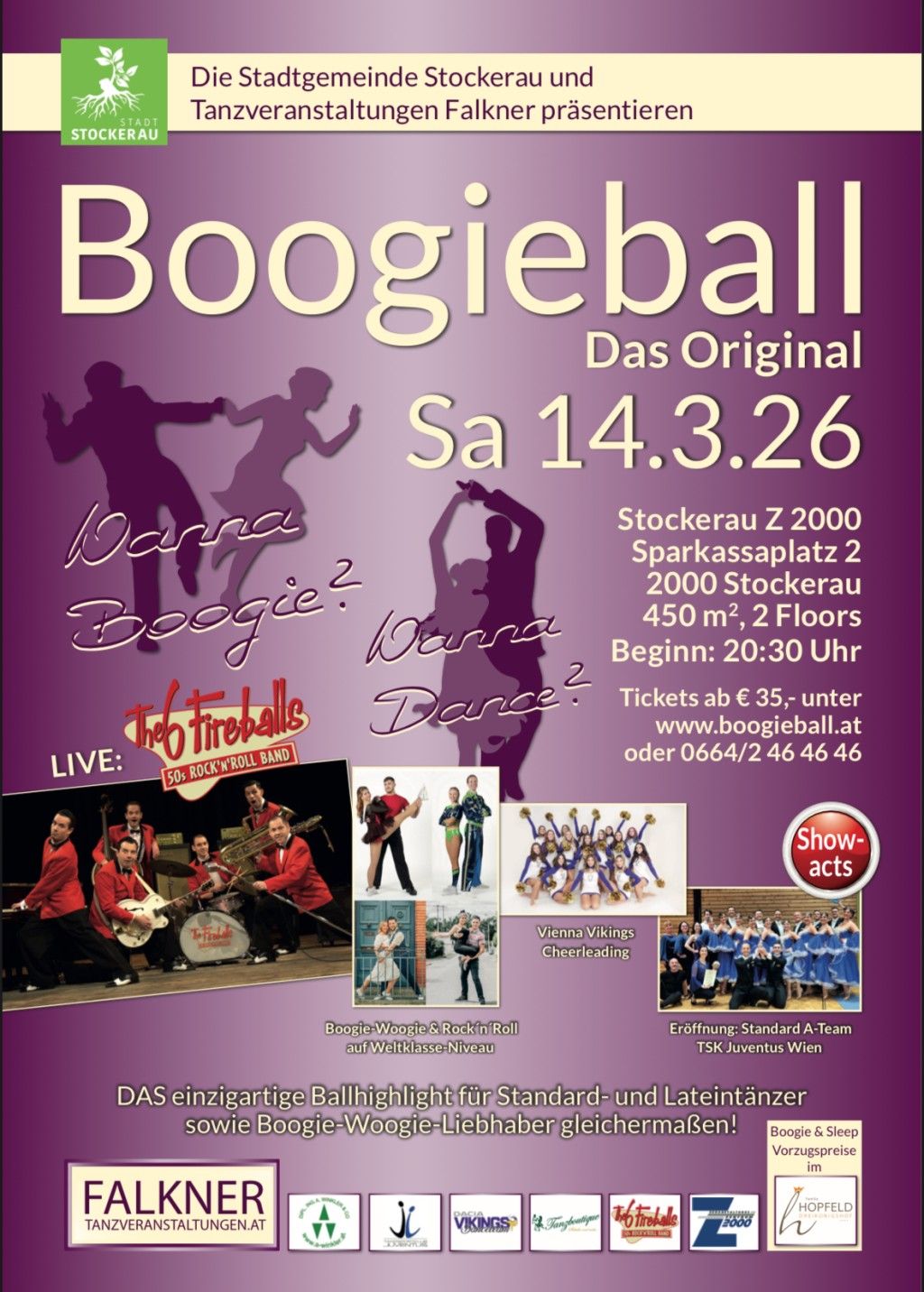 Unser größter Event findet zum 11. Mal im Veranstaltungszentrum Z2000 in Stockerau – der perfekt geeigneten, multifunktionalen Location – statt! Die einzigartige Kombination von „The 6 Fireballs“ mit traumhafter „Wanna Dance?“ Tanzmusik unserer Tanz-DJs im Hauptsaal auf 250m ² Parkett-Tanzfläche garantiert einen perfekten Musik- und Tanz-Mix für alle Ballgäste. Alle Sitzplätze befinden sich im hellen, großen Hauptsaal mit toller Galerie – somit sind alle Ballgäste direkt beim Ball-Geschehen dabei!