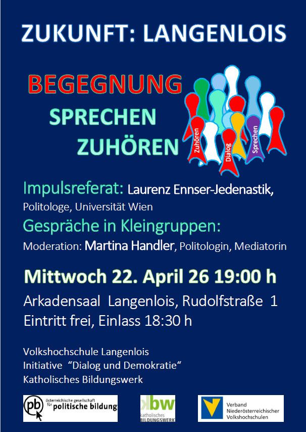 miteinander zu reden – und einander aufmerksam zuzuhören. Der Abend wird gemeinsam von der Volkshochschule Langenlois, der Initiative „Dialog und Demokratie“ und dem Katholischen Bildungswerk veranstaltet. Anmeldung ist nicht erforderlich – bitte einfach hinkommen!