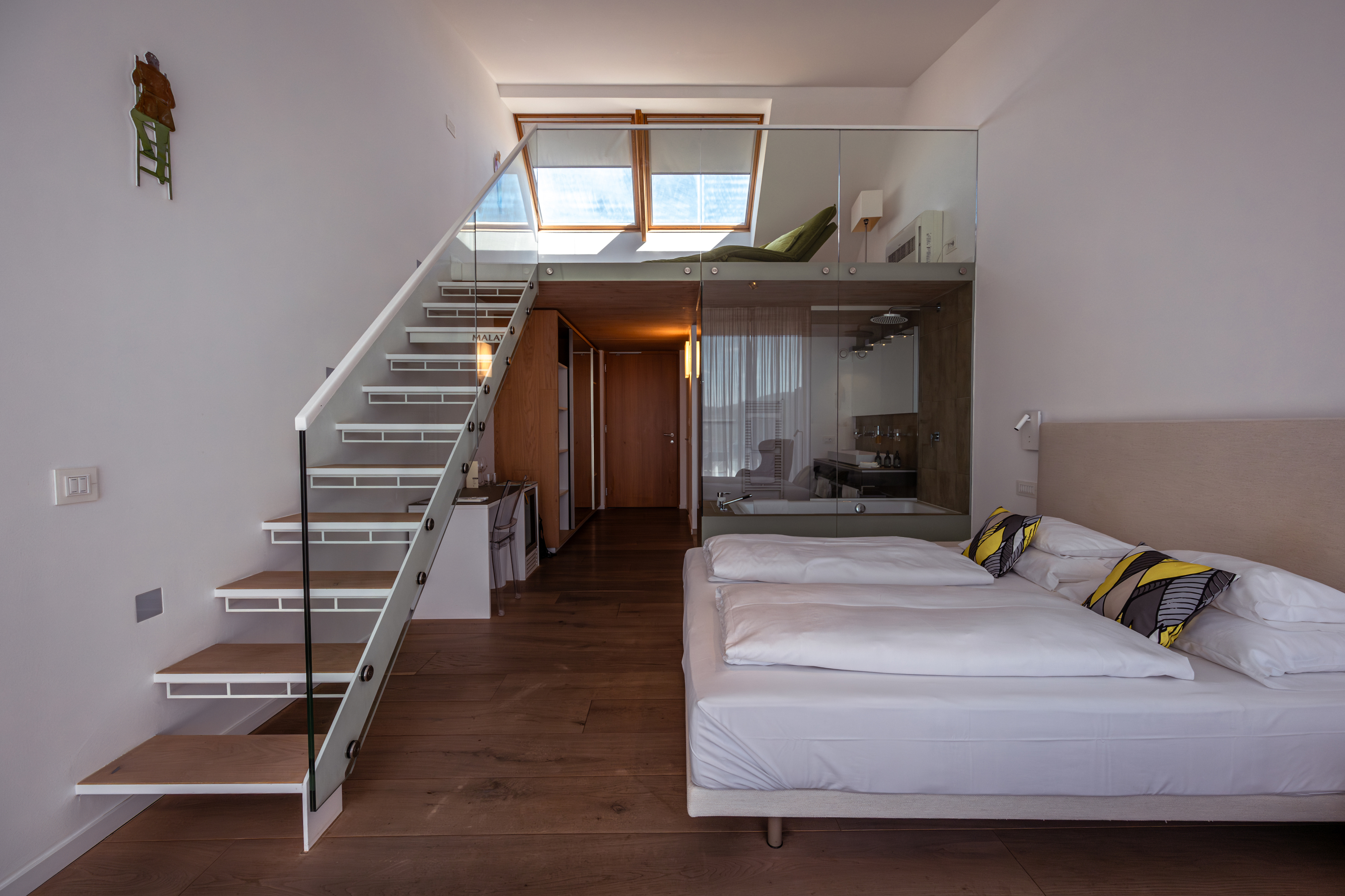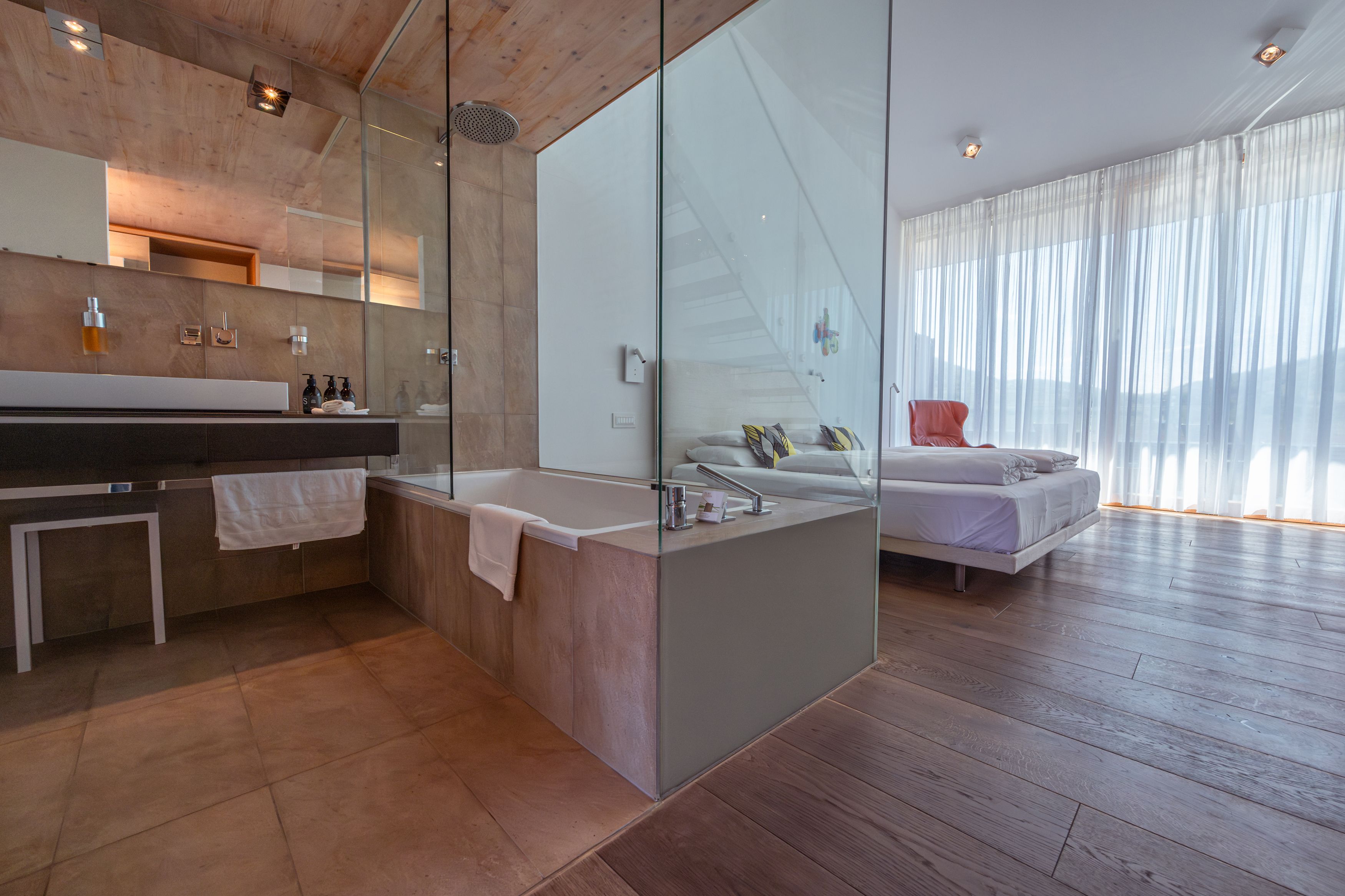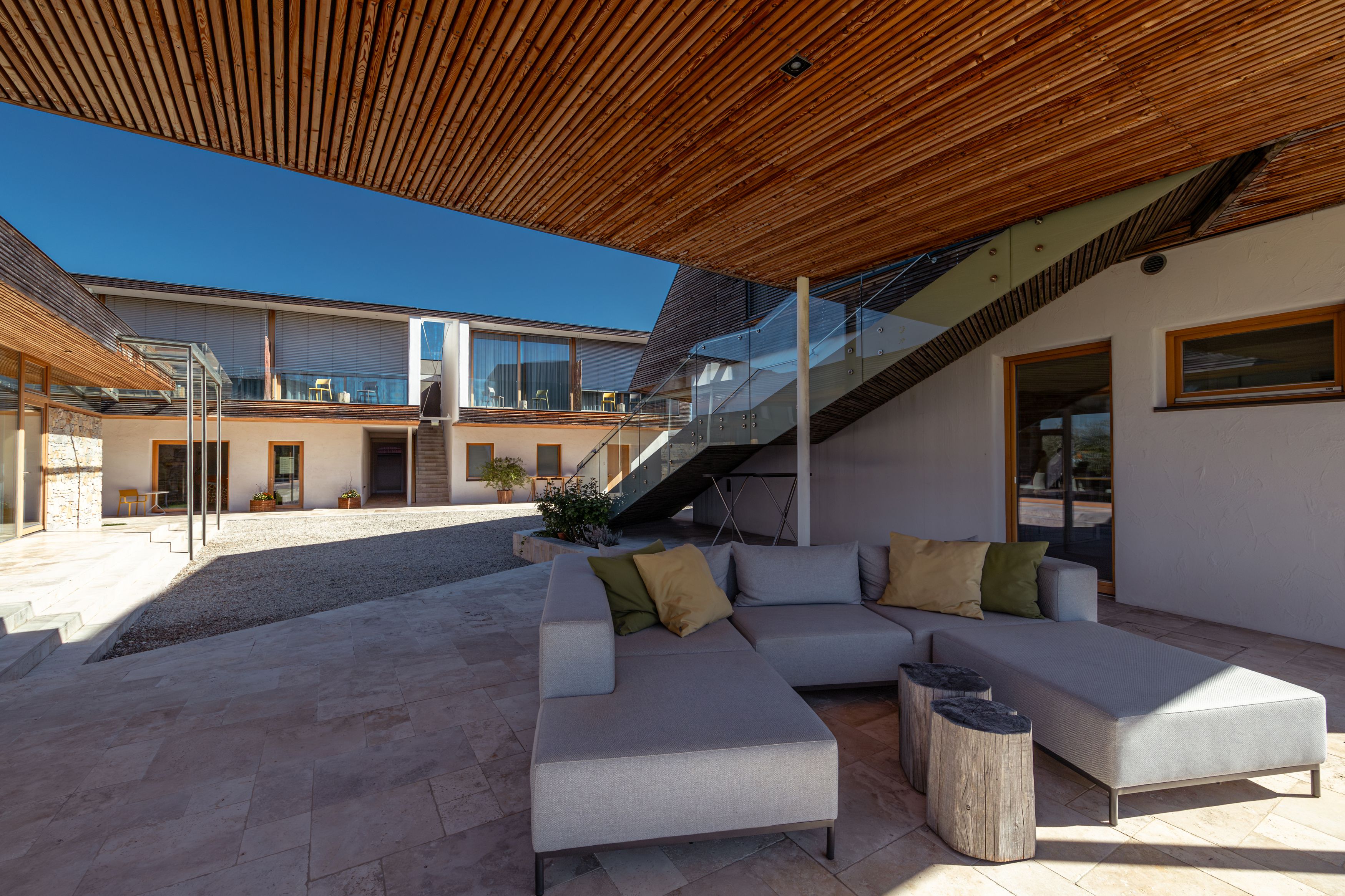 Direkt am Weingut Malat wurde ein altes Hafnerhaus aufwendig zum Hotel umgebaut – ganz modern, aber mit viel Holz und Stein als Hommage an die alten Zeiten. Es bietet insgesamt 10 Suiten mit hochwertigen Wittmann-Möbeln und einem atemberaubenden Blick auf das Stift Göttweig sowie die umliegenden Weingärten. Die Gäste sollen sich hier wie zuhause fühlen. Darum darf man im Hotel ganz einfach eine Flasche Wein aus dem Kühlschrank nehmen, eine Schallplatte auflegen und sich ein oder mehr Gläschen davon auf der Terrasse gönnen.