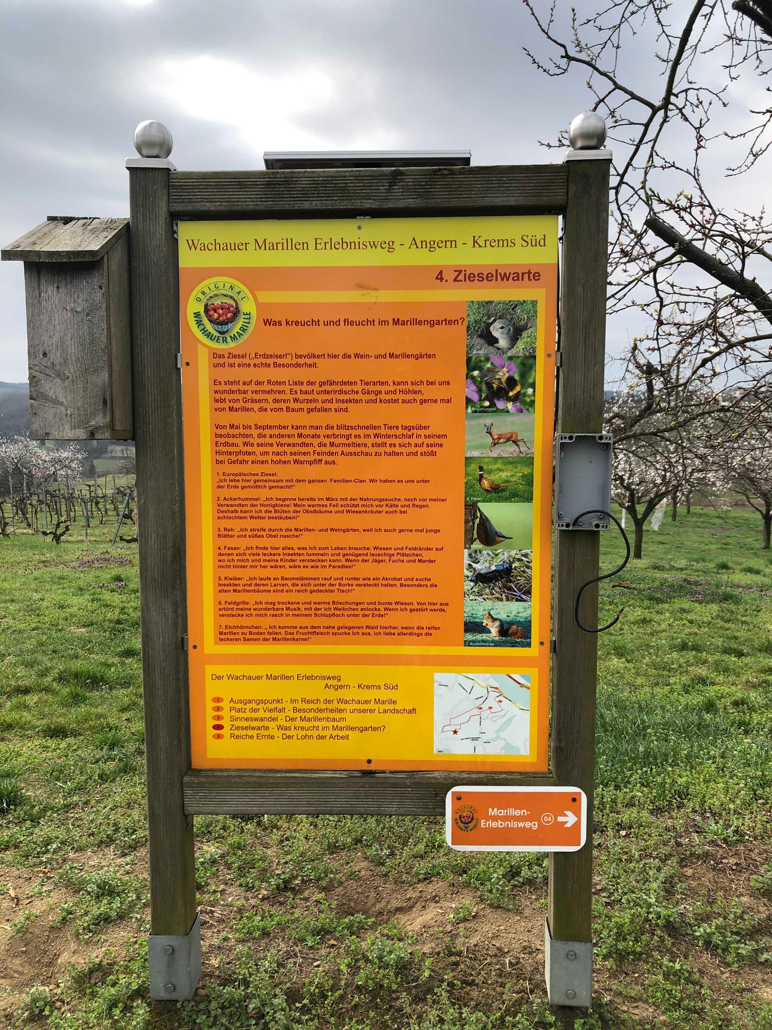 Der ca. 7 Kilometer lange Rundweg beginnt und endet beim Weinhof Aufreiter in Krems-Angern oder bei Lillis Marillengarten in Paudorf. Mehrere Stationen laden dazu ein, mehr über die Tiere im Marillengarten, die Baumblüte und die Arbeit im Marillengarten zu erfahren.