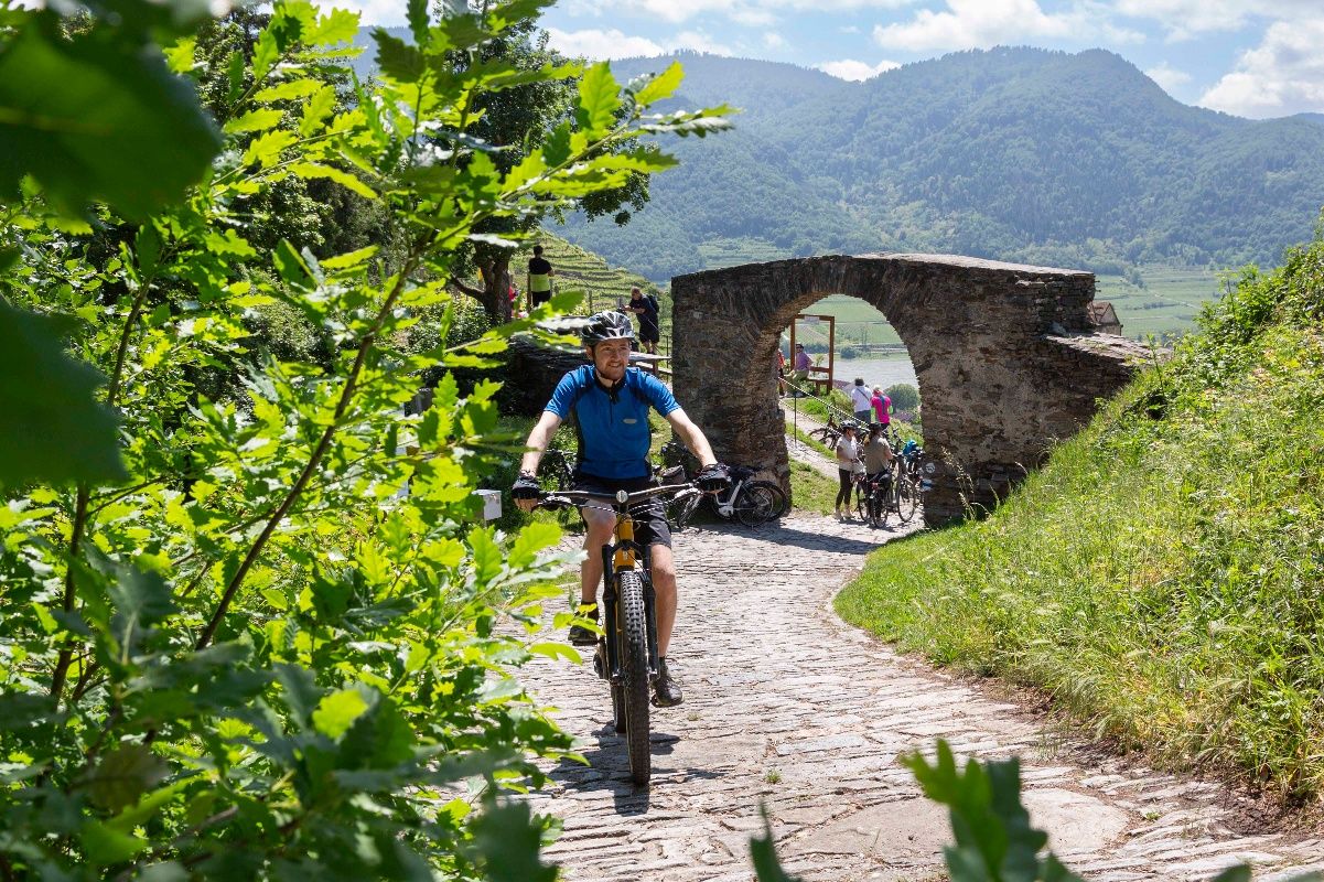 Wir starten am Bahnhof Spitz und fahren über das malerische Mieslingtal Richtung Mühldorf. Von dort erklimmen wir die Bärenwände, um einen herrlichen Blick ins Waldviertel zu genießen. Wir fahren weiter nach Wolfenreith, um über bezaubernde Wald- und Feldwege zur Buschandlwand zu gelangen. Schließlich erreichen wir Wösendorf und genießen einen traumhaften Blick über die Weinberge ins Donautal. Zurück in Spitz fahren wir zum Wahrzeichen des Ortes, dem Roten Tor und weiter über Weinbergwege zurück zum Bahnhof. Es erschließen sich uns dadurch grandiose Blicke über Spitz mit seinen steilen Weinbergterrassen, der Kirche und der Ruine Hinterhaus.