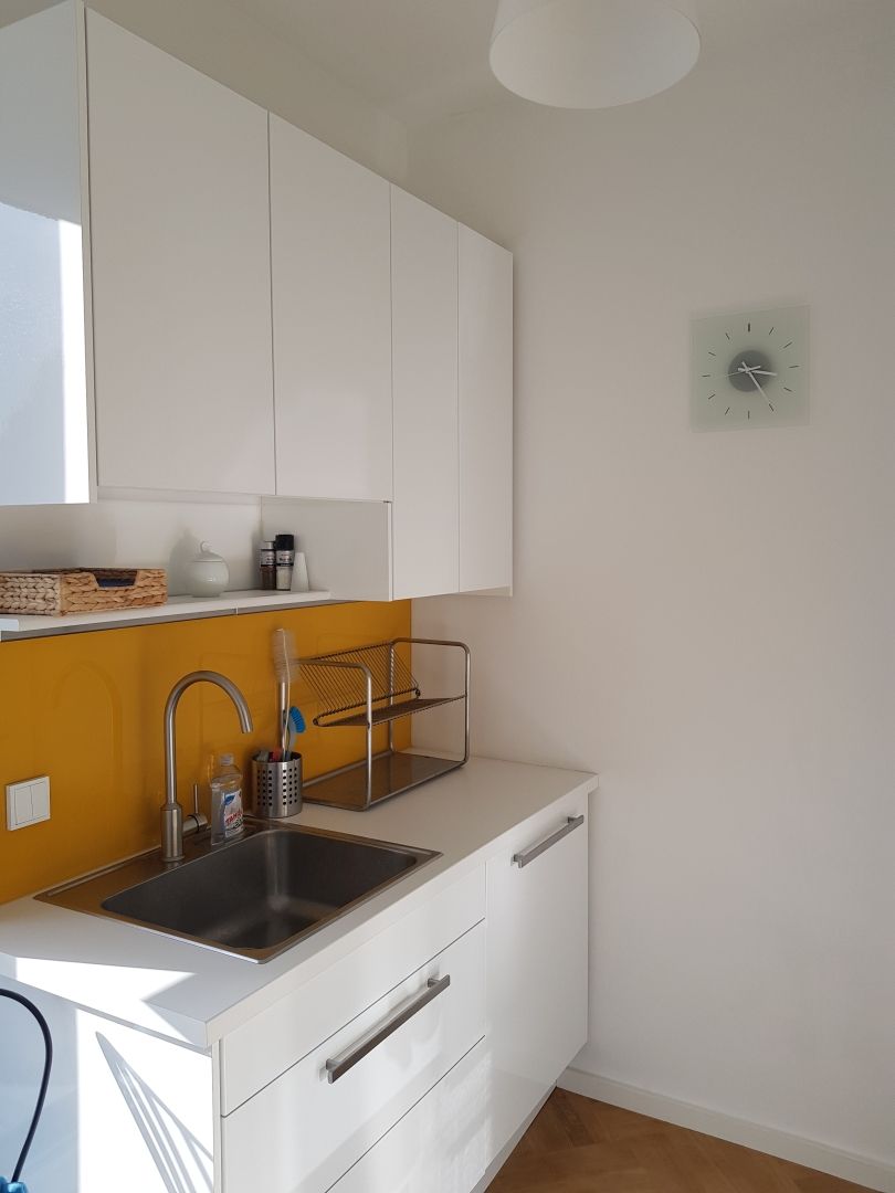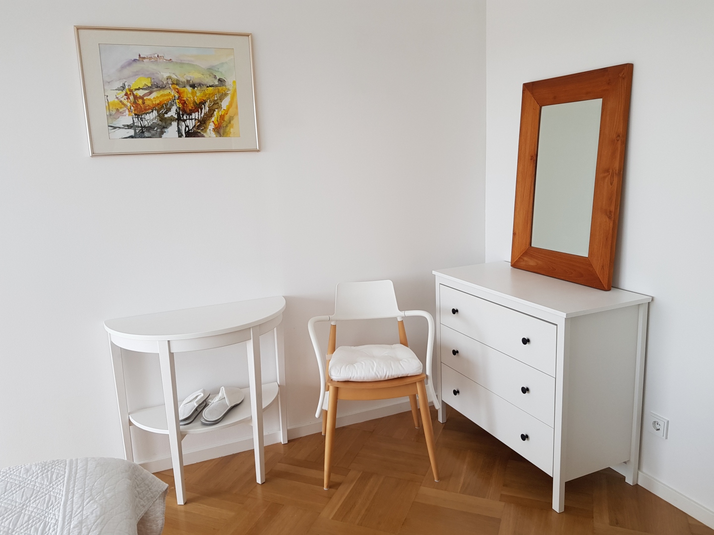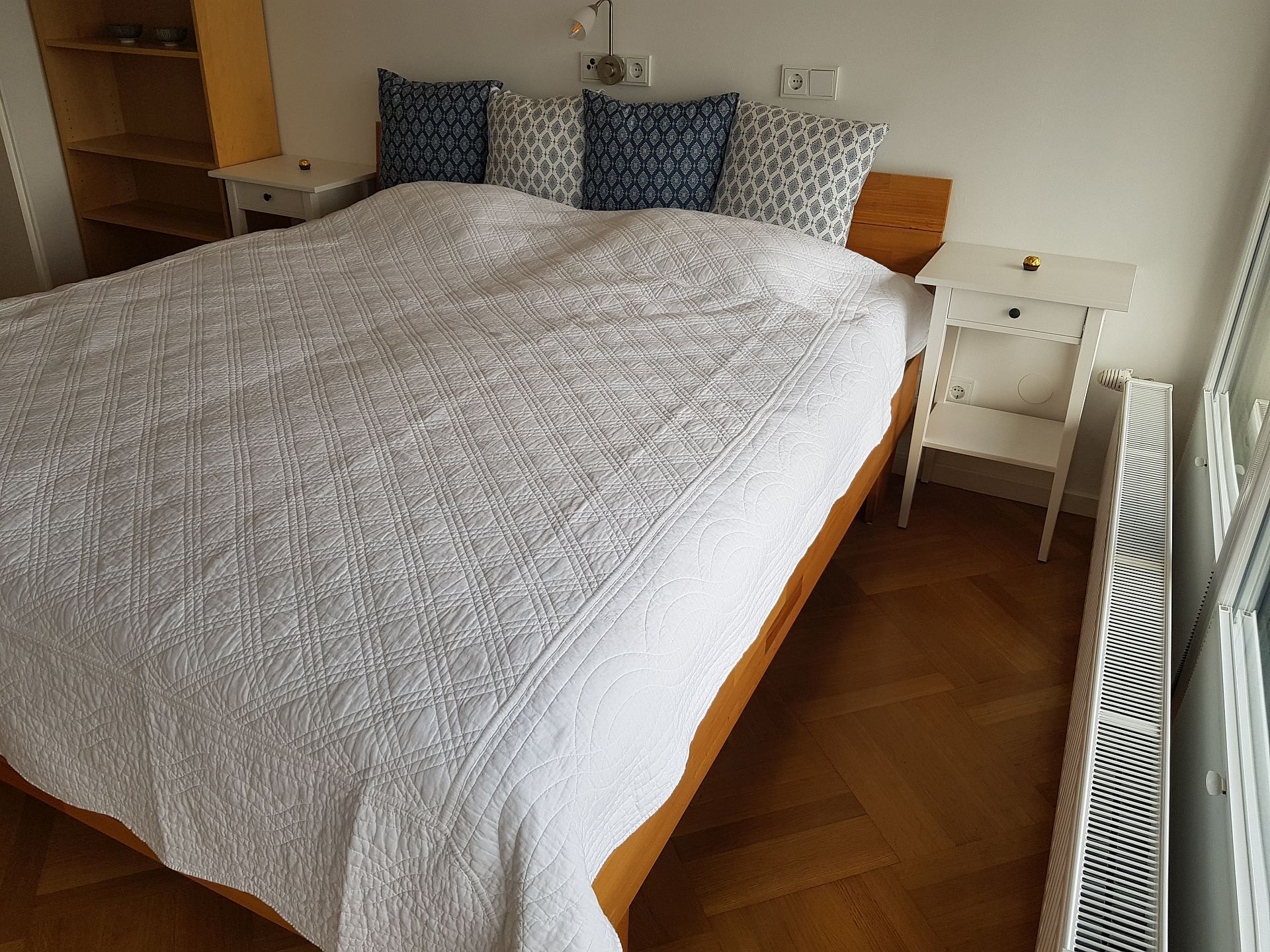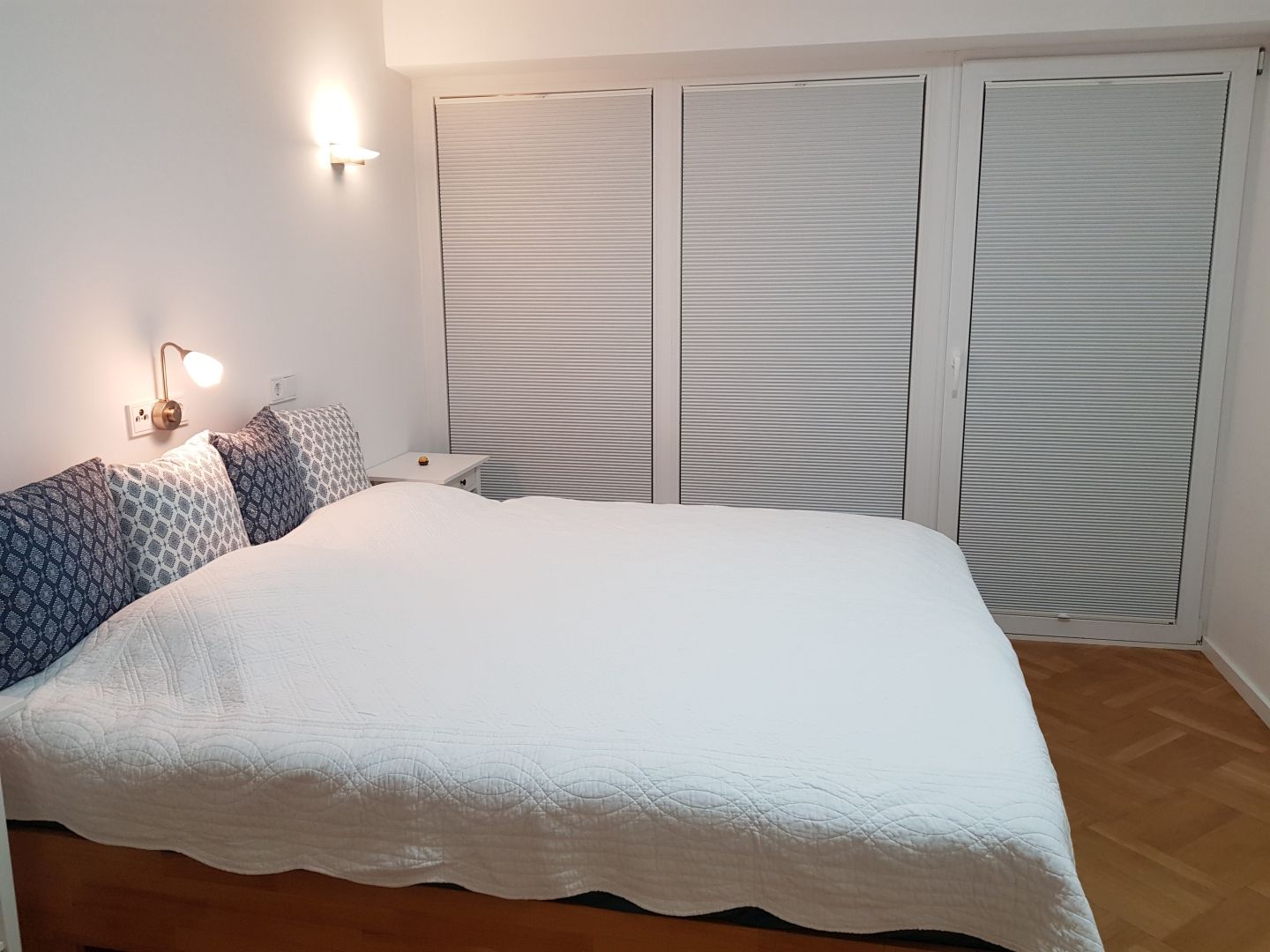 Der Vorraum verfügt über Garderobe und Kleiderschrank, das Schlafzimmer über eine Kommode, einen kleinen Tisch, Spiegel und Nachtkästchen. Dimmbares LED-Licht sorgt für eine flexible Beleuchtung. Im Wohnzimmer befindet sich ein 38-Zoll-TV-Gerät, ein Esstisch für vier Personen sowie das ausziehbare Dreiersofa als zusätzliche Schlafgelegenheit. Südlich der Terrasse liegt ein schmaler, eingezäunter Garten, der gemeinsam mit den Bewohnern der zweiten Wohnung im selben Geschoss genutzt wird und auch für Kinder geeignet ist.