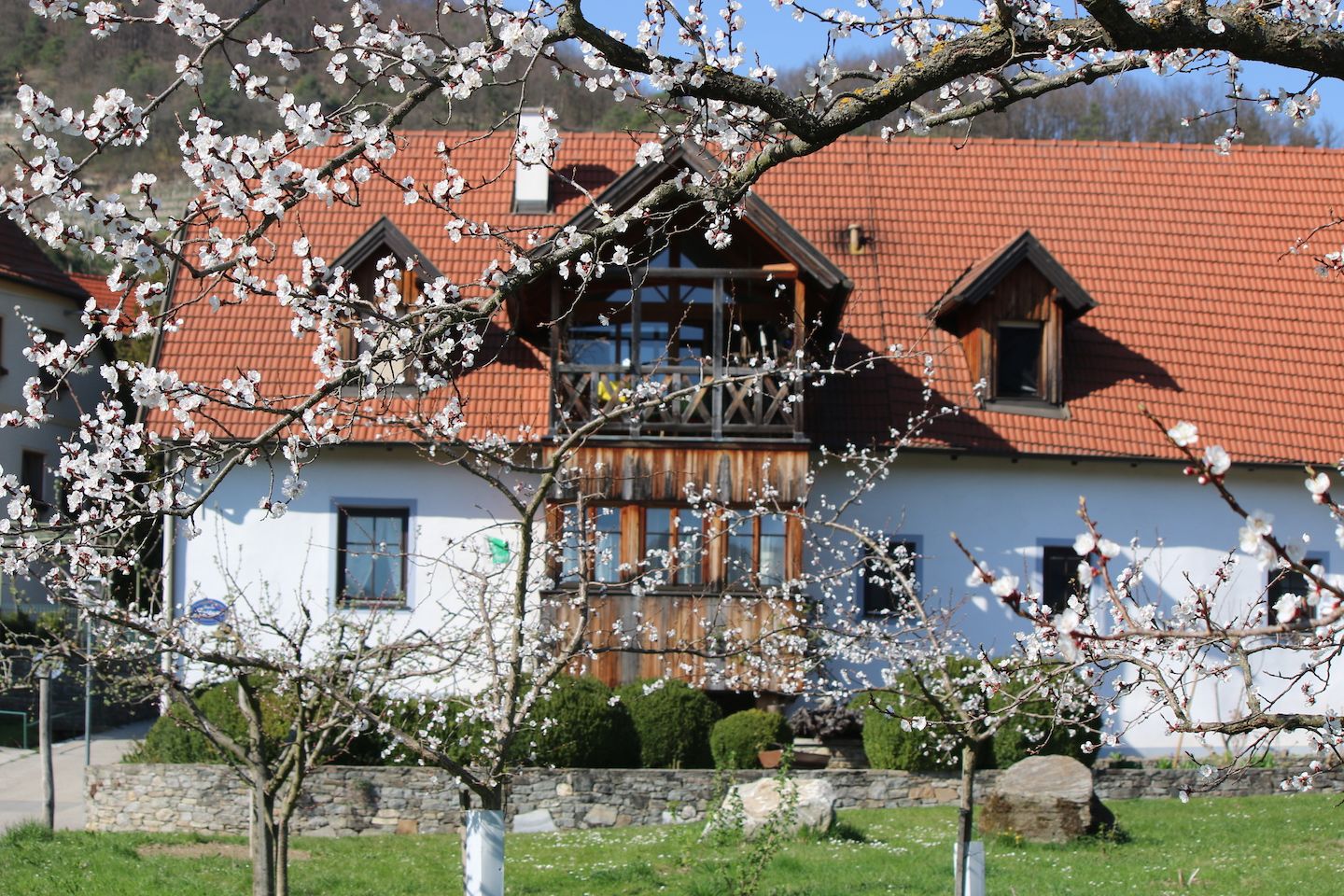 Ein großzügiger Garten mit Liegewiese und Liegestühlen lädt zum Entspannen, Lesen oder Sonnenbaden ein. WLAN steht kostenlos zur Verfügung, ein Fahrradabstellraum ist vorhanden – Gäste können die Wachau bequem per Rad erkunden. Parkplätze am Haus sind verfügbar. Die Ortslage ist ruhig und dennoch zentral, mitten zwischen Weingärten, optimal für Genießer und Ruhesuchende.