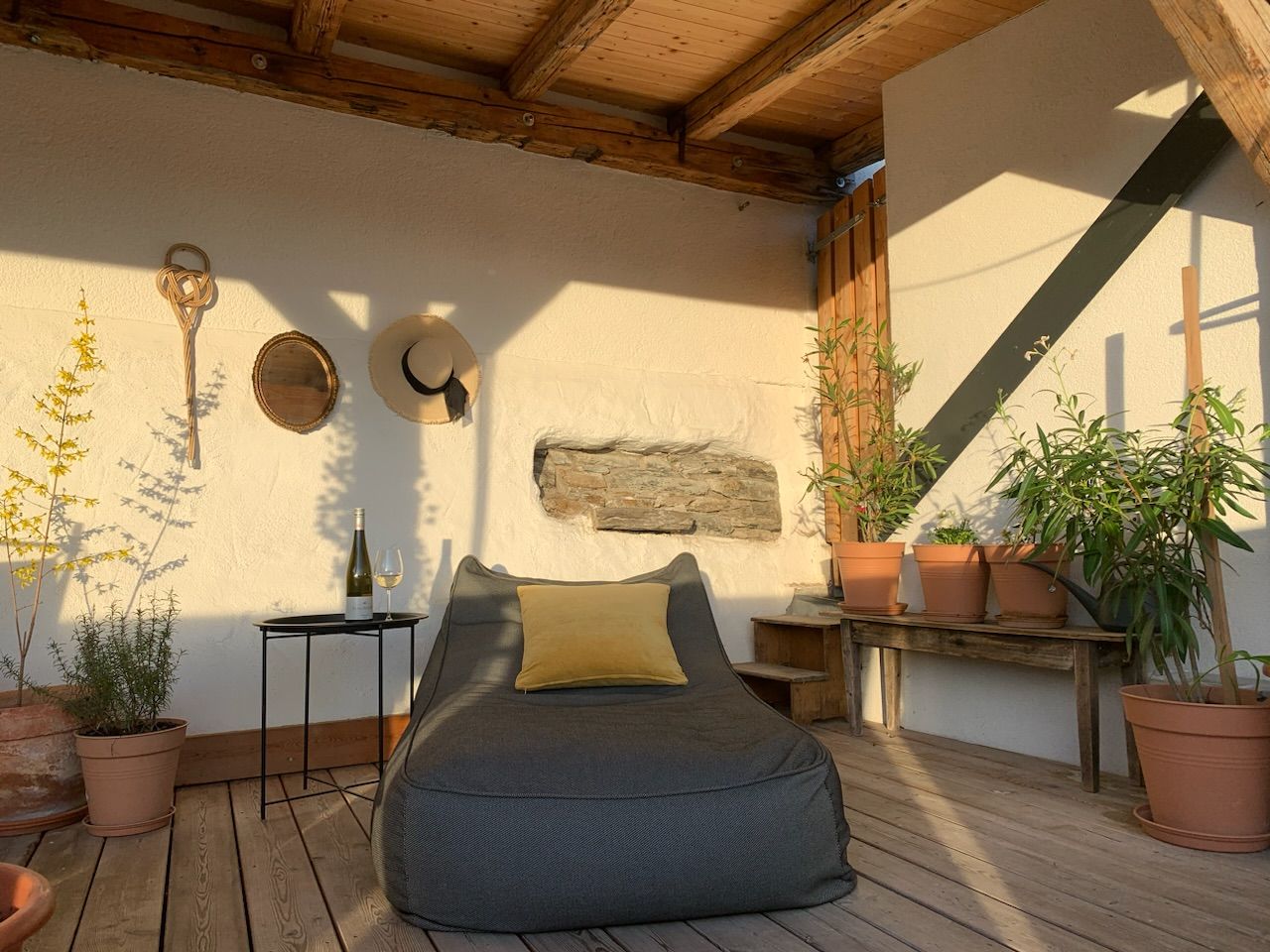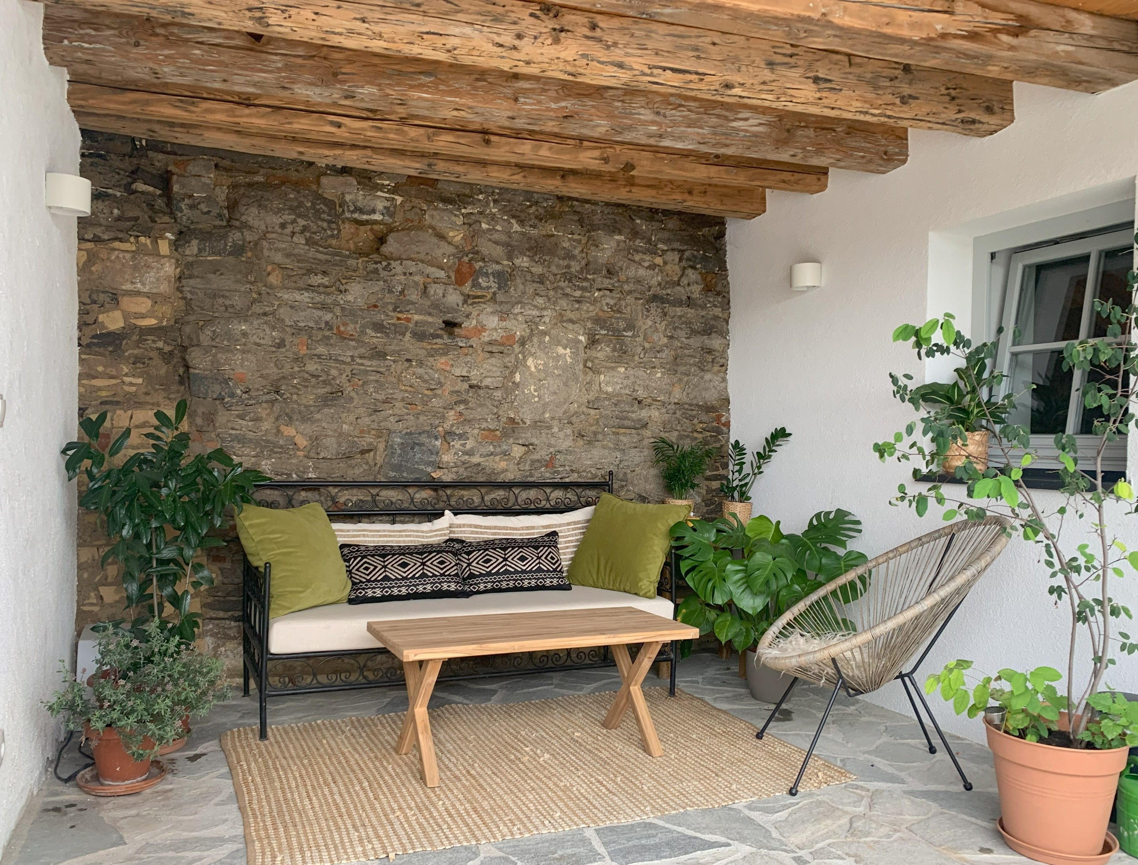 Die beiden Studios im Erdgeschoss teilen sich einen begrünten Innenhof mit zwei separaten Sitzbereichen, ideal zum Entspannen im Freien. Die großzügige Wohneinheit im Obergeschoss verfügt über eine eigene Sonnenterrasse mit Ausblick in die umliegende Landschaft.