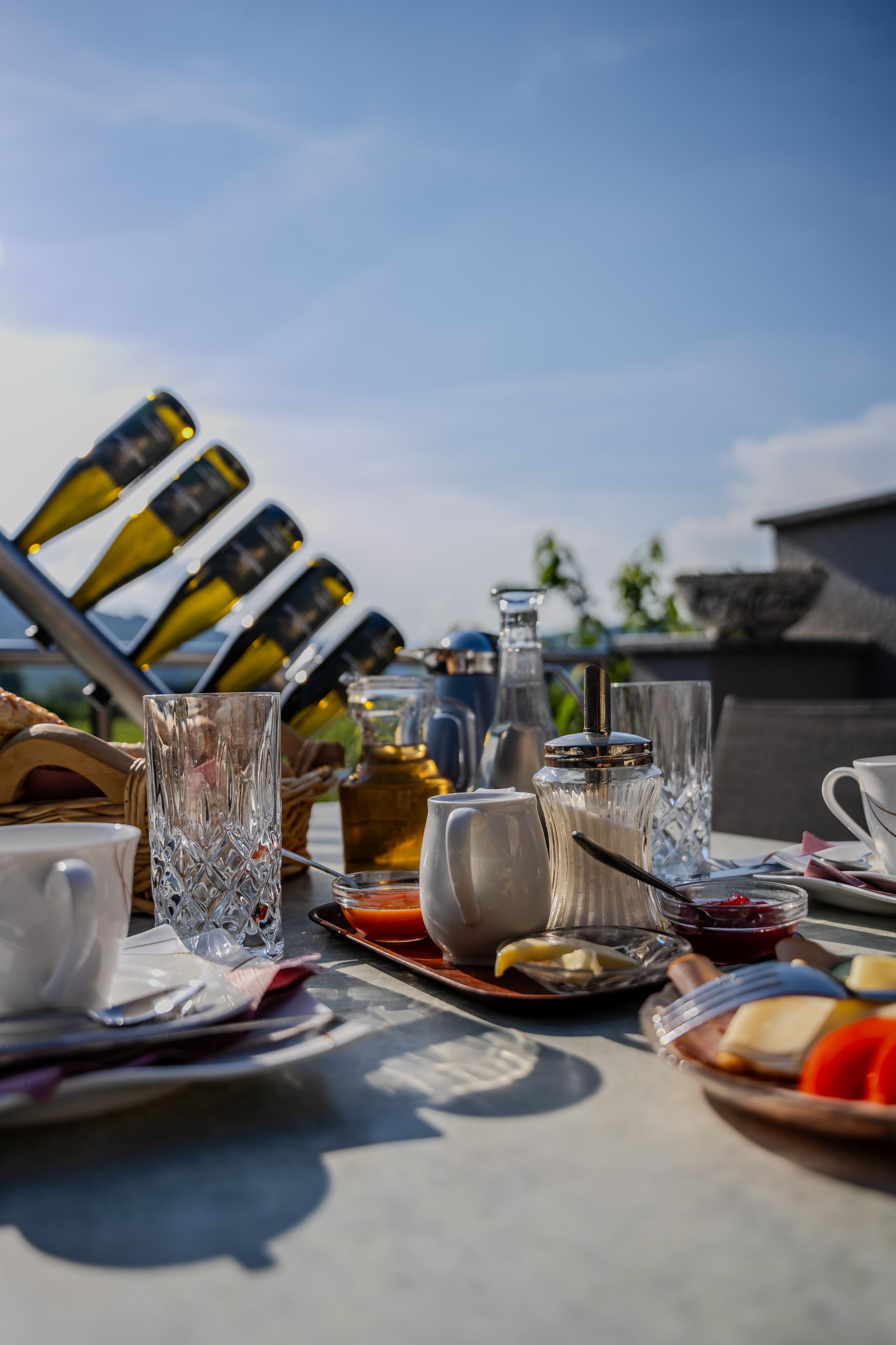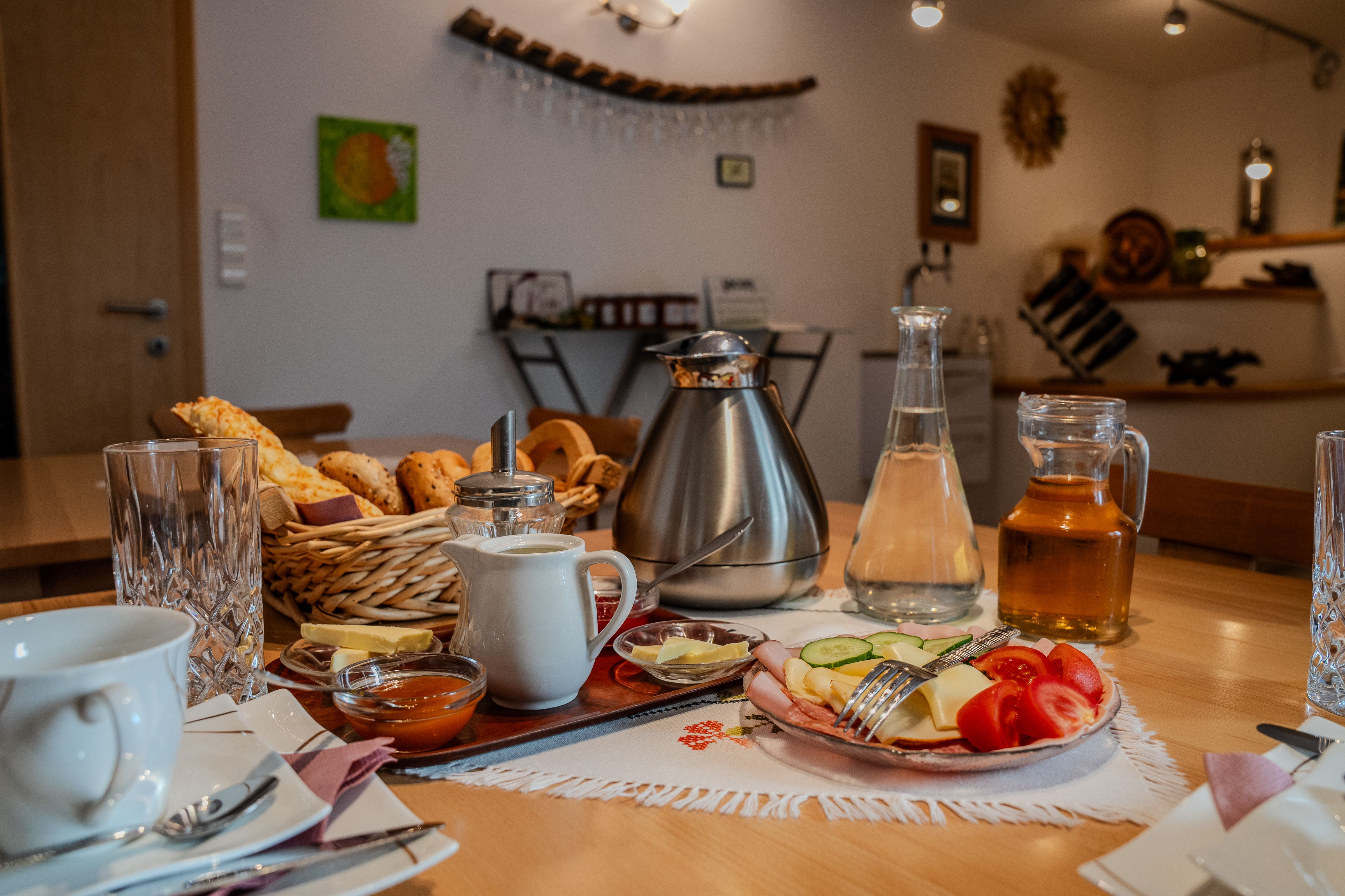 Im Preis für die Doppelzimmer ist ein reichhaltiges Frühstück enthalten, das auf Wunsch auch auf der Terrasse serviert wird – bei schönem Wetter ein idealer Start in den Tag. Für Gäste der Ferienwohnung wird das Frühstück gegen Aufpreis angeboten. Darüber hinaus können jederzeit alkoholfreie und alkoholische Getränke, einschließlich der hauseigenen Weine, konsumiert werden.