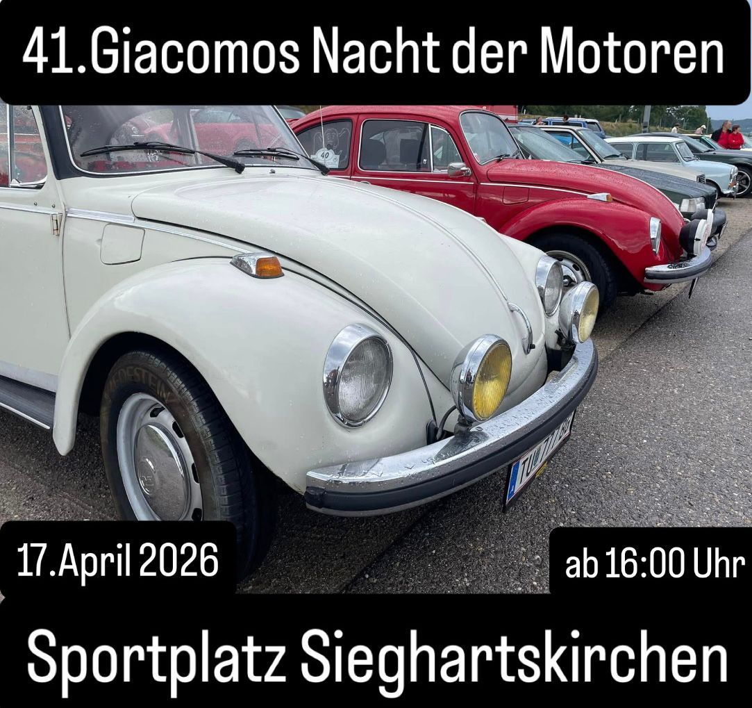 Die erste Gelegenheit der neuen Saison bietet die 41. Ausgabe des traditionsreichen Oldtimertreffens „Giacomos Nacht der Motoren“ am Freitag, dem 17.4.26 ab 16 Uhr am Sportplatz von 3443 Sieghartskirchen / NÖ (direkt an der B1 im Tullner Feld).