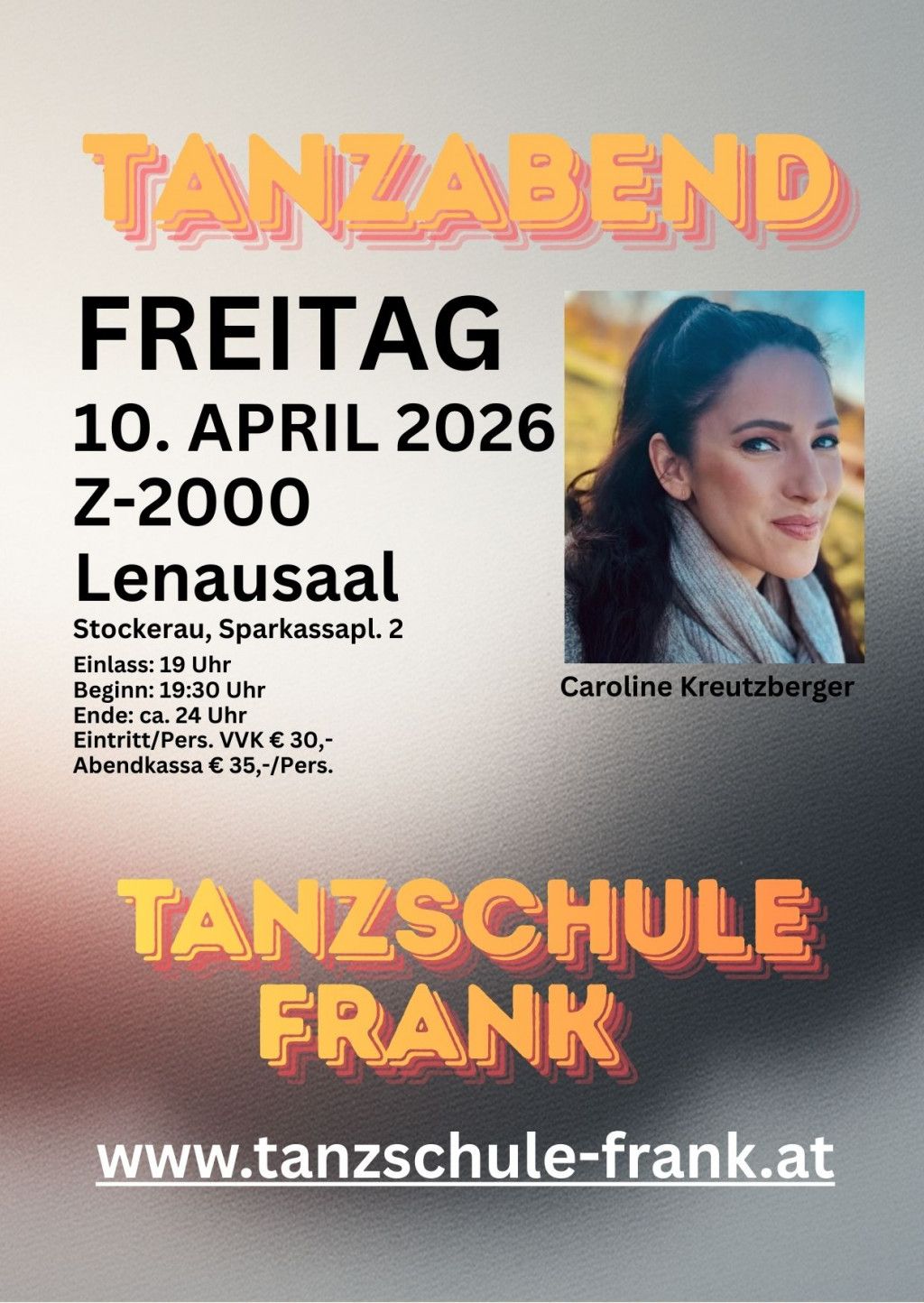 Die Tanzschule Frank und Caroline Kreutzberger freut sich darauf, Sie persönlich begrüßen zu dürfen und gemeinsam mit Ihnen einen schwungvollen Abend zu verbringen: