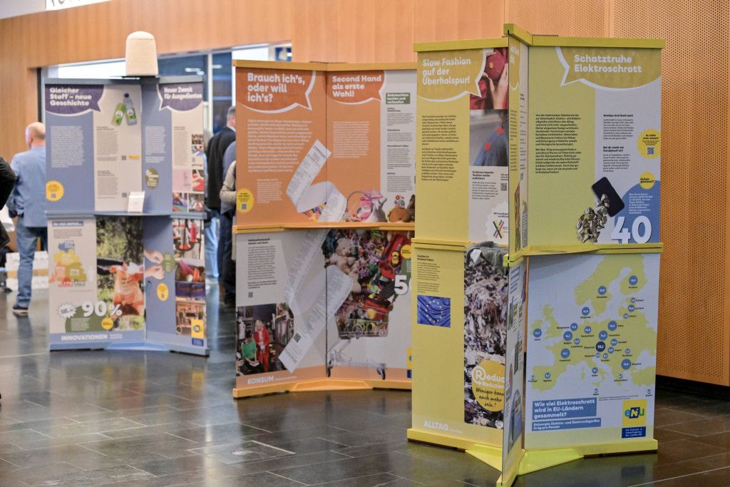 Die Ausstellung selbst ist ein konkretes Beispiel für gelebte Kreislaufwirtschaft: Aus upgecycelten und nachwachsenden Materialien gestaltet, wird das Thema anschaulich vermittelt und direkt erfahrbar gemacht.