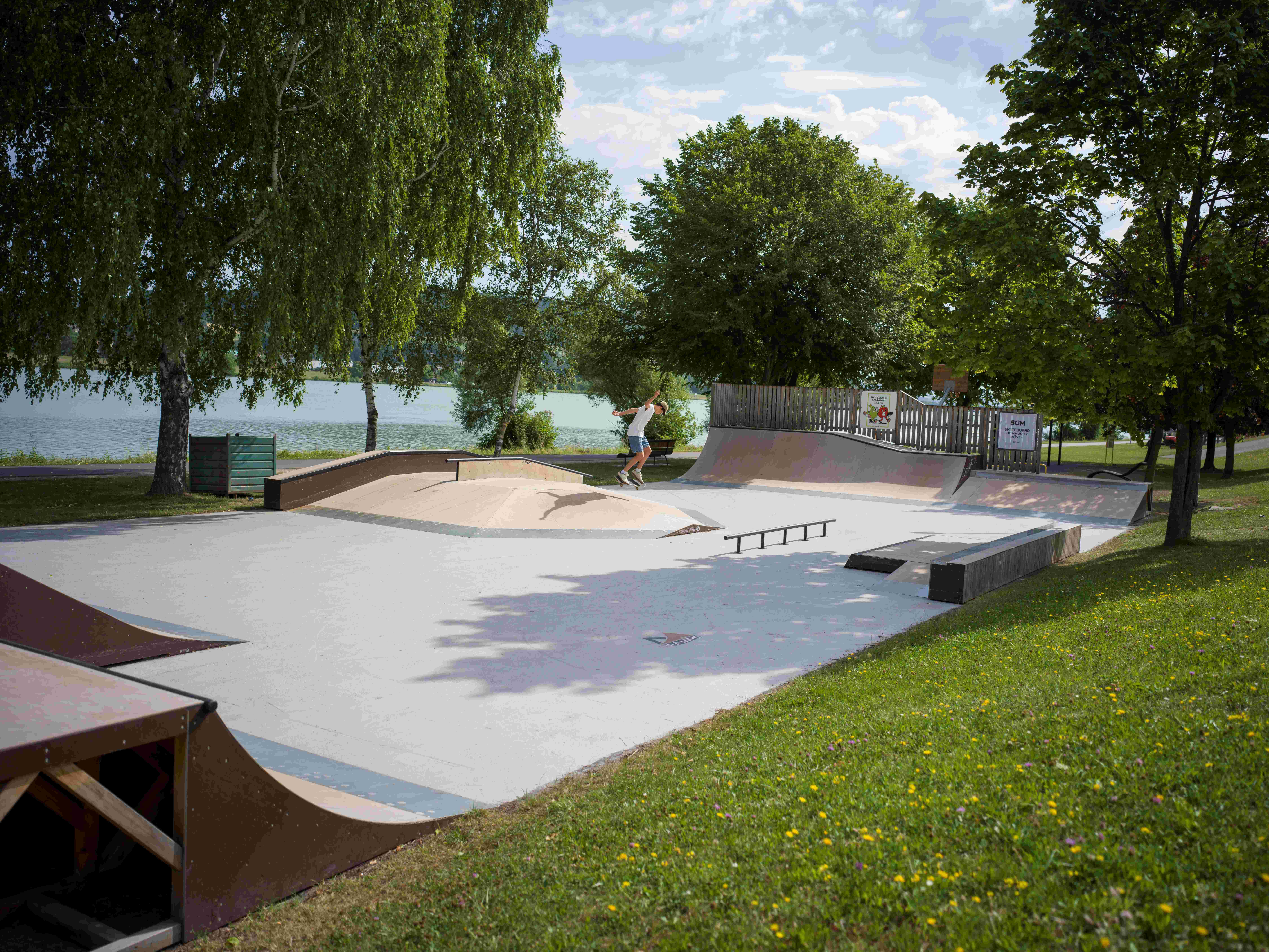 Die Donau.Auszeit.Wiese in Pöchlarn ist Begegnungszone, Erholungsraum, Bewegungsarena und Genußplatz in einem großen Erholungsraum direkt am Wasser. Am Donau-Radweg gelegen trifft man sich am neuen Skaterplatz, trainiert auf der Calisthenicsanlage, klettert über das große Schwemmholzgerüst oder tobt sich auf den Bodentrampolinen aus.