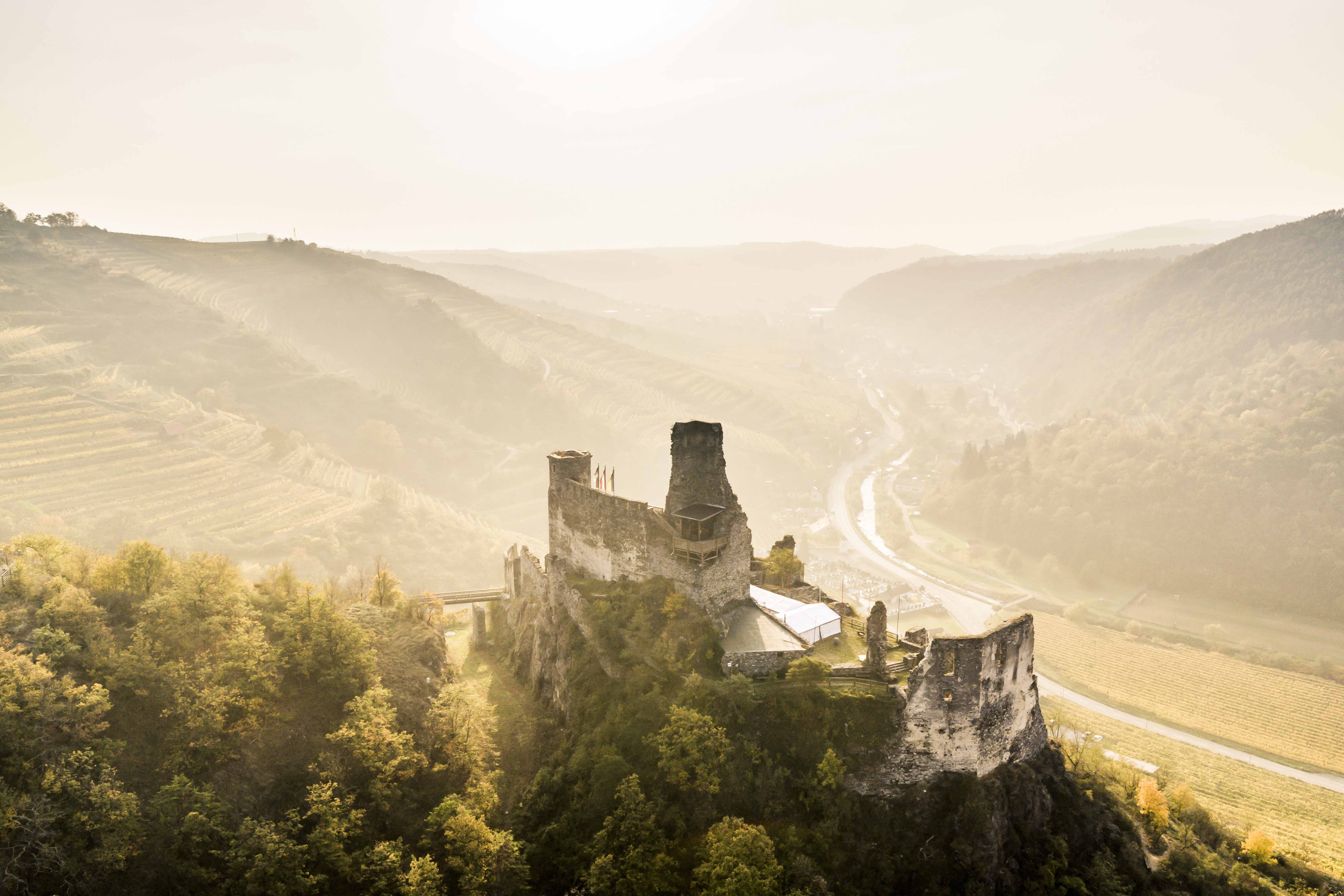 Nach einem kurzen Aufstieg, vorbei an der gotischen Wehrkiche oder über die PKW-Zufahrt von der Ortsmitte, kann man den einmaligen Ausblick senkrecht hinab zu den ältesten Häusern des Ortes und auf die Weinterrassen bis zum Donautal genießen. Das Ruinengelände ist ganzjährig frei zugänglich.