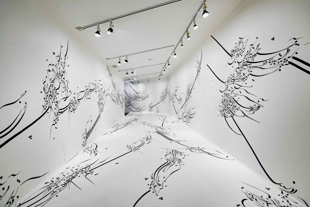 Ein Raum, in dem die Wände und der Boden von Schriftzeichen bedeckt sind – Linien, Bögen, Kurven, die wie ein Tanz über die Oberfläche fließen. Mit „Written Room“ erschafft Parastou Forouhar (*1962) eine Installation, die durch ihre präzise Handarbeit eine unverwechselbare Atmosphäre entstehen lässt.