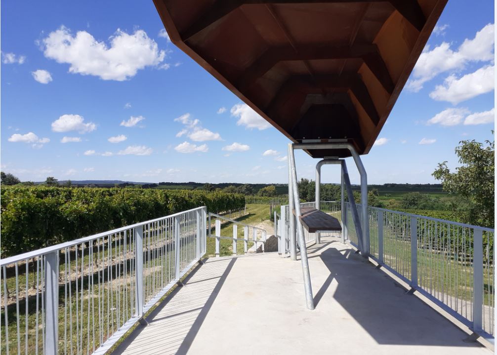 Die Aussichtsplattform Eisen.Hut thront auf der Riede Eisenhut, einem der höchsten Punkte am Wagram. Ihre markante Dachskulptur aus Corten-Stahl greift den Namen und die regionale Eisenvorkommen auf.