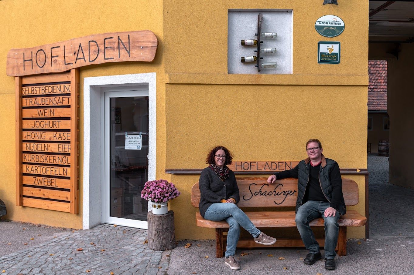 Der Hofladen der Familie Schachinger bietet eine breite Palette von Produkten an, darunter hauseigene Weine, Traubensaft, Kürbiskernöl, Joghurt, Frischkäse, Schnittkäse, Honig, Kartoffeln und Zwiebeln. Der Hofladen ist täglich von 08:00 bis 20:00 Uhr geöffnet.
